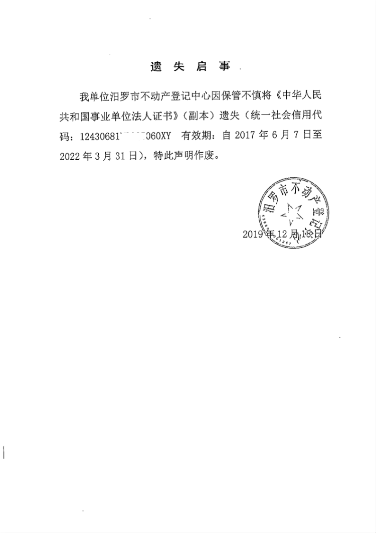 遗失启事(汨罗市不动产登记中心)