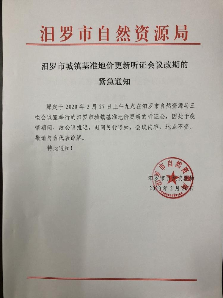 汨罗市城镇基准地价更新听证会议改期的紧急通知
