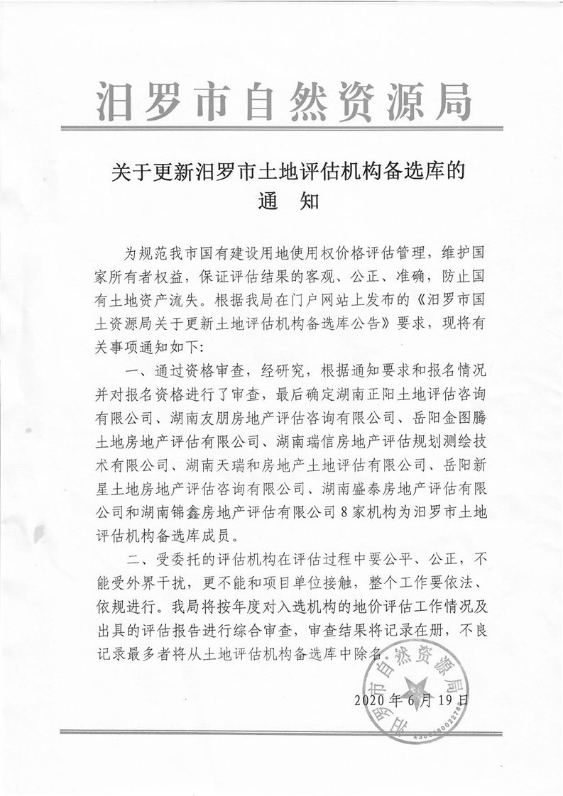 关于更新汨罗市土地评估机构备选库的通知