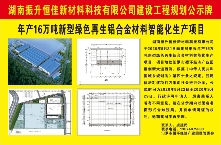 汨罗市振升恒佳新材料科技有限公司建设工程规划公示牌-年产16万吨新型绿色再生铝合金材料智能化生产项目