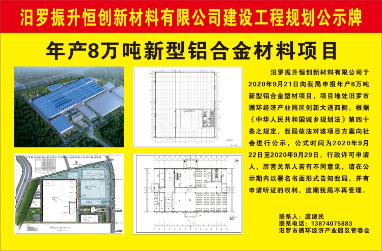 汨罗市振升恒创新材料有限公司建设工程规划公示牌-年产8万吨新型铝合金材料项目