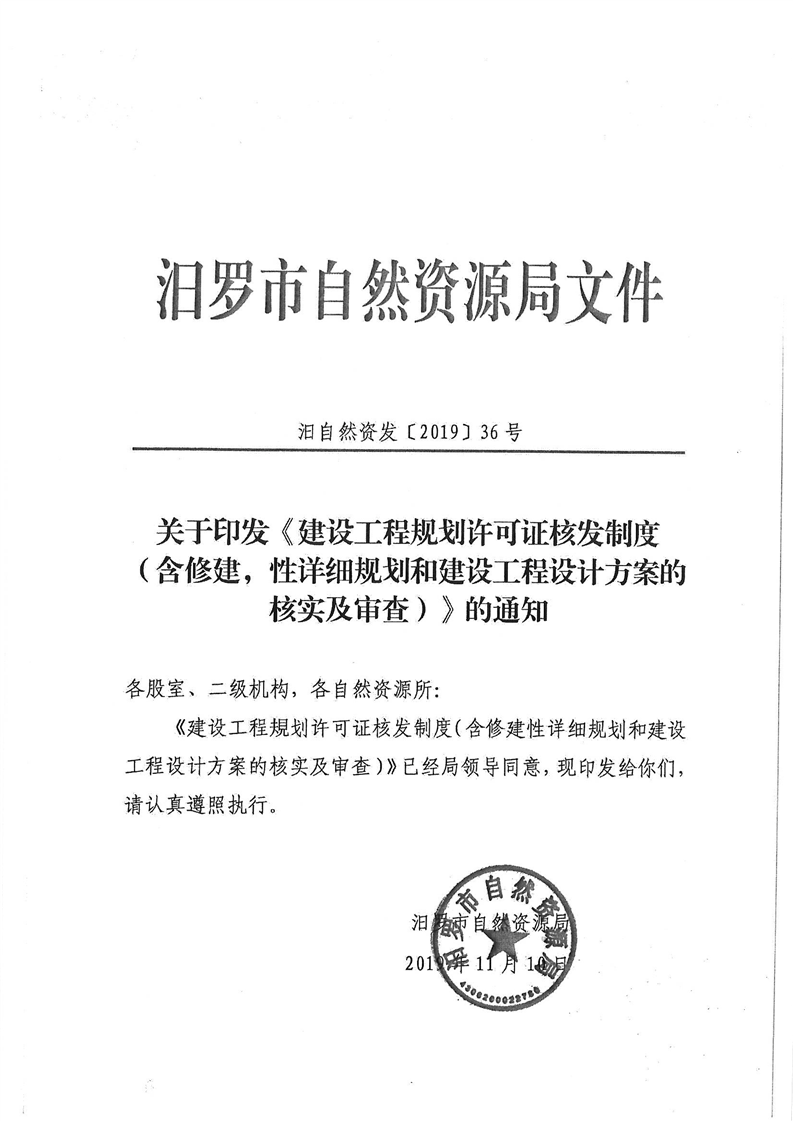 关于印发《建设工程规划许可证核发制度(含修建,性详细规划和建设工程设计方案的核实及审查)》 的通知(汨自然资发〔2019〕36号)