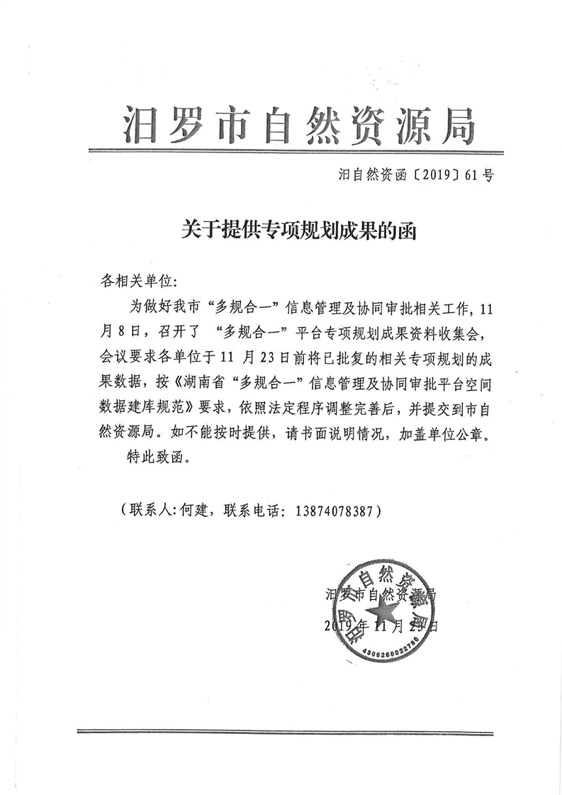 关于提供专项规划成果的函(汨自然资函〔2019〕61号)