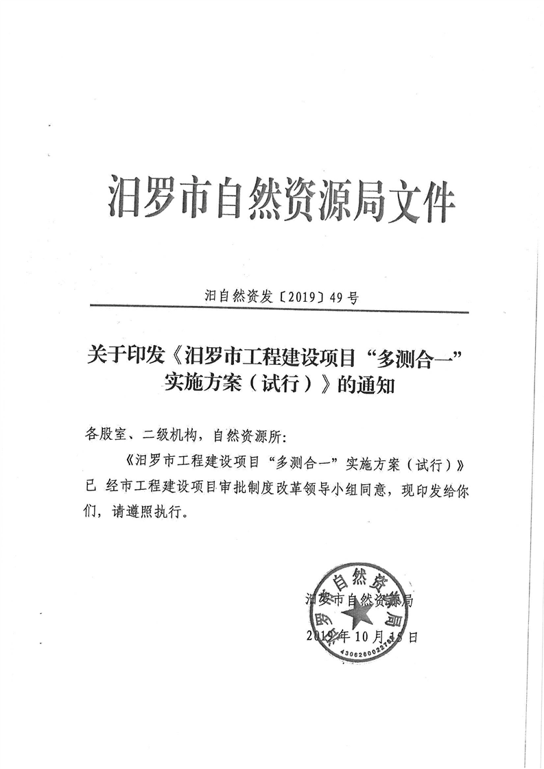 关于印发《汨罗市工程建设项目“多测合一”实施方案(试行)》的通知(汨自然资发〔2019〕49号)