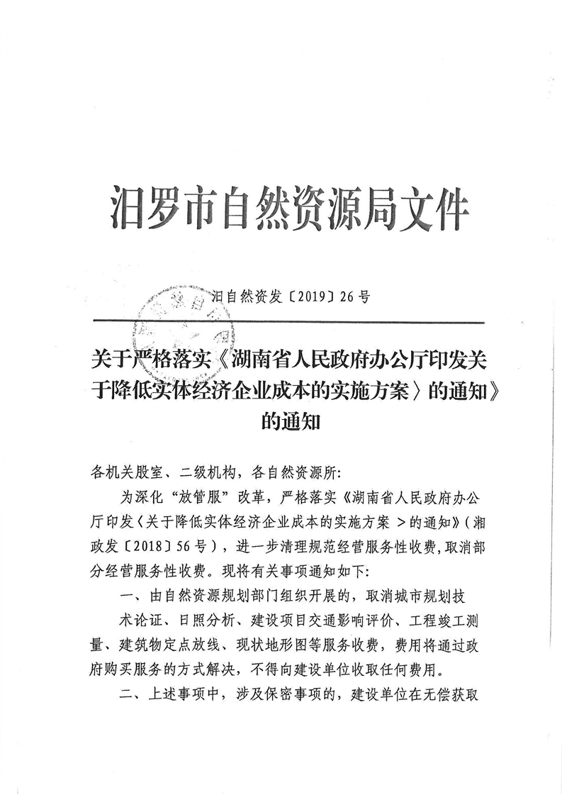 关于严格落实《湖南省人民政府办公厅印发关于降低实体经济企业成本的实施方案的通知》的通知(汨自然资发〔2019〕26号)