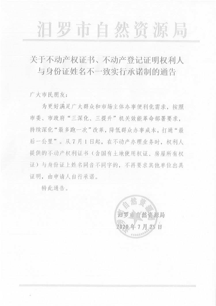 关于不动产权证书、不动产登记证明权利人与身份证姓名不一致实行承诺制的通告