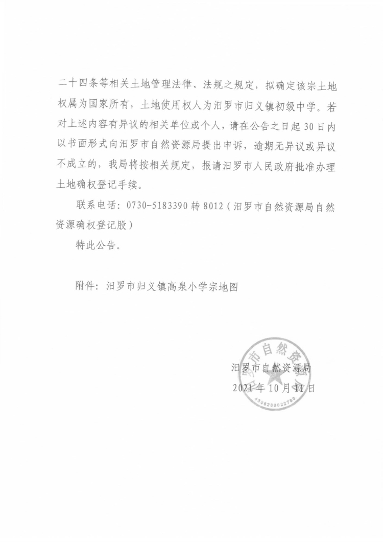 关于确定汨罗市归义镇初级中学(高泉小学)国有建设用地使用权的公告