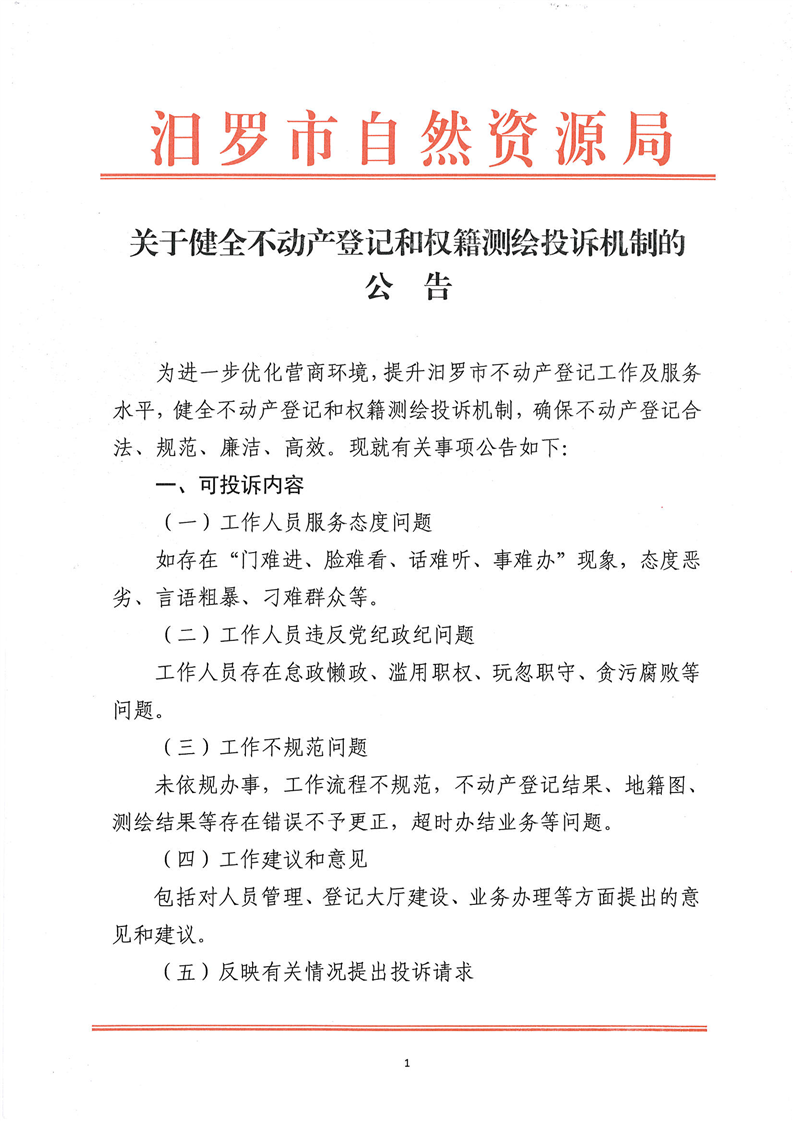 关于健全不动产登记和权籍测绘投诉机制的公告