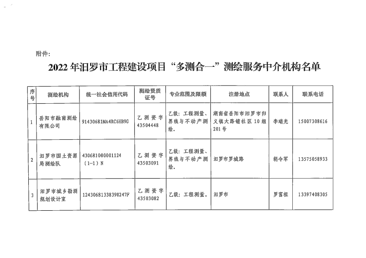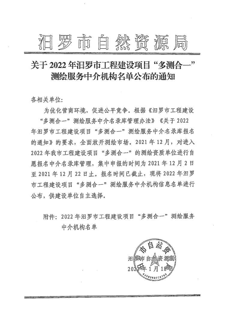 关于2022年汨罗市工程建设项目“多测合一”测绘服务中介机构名单公布的通知