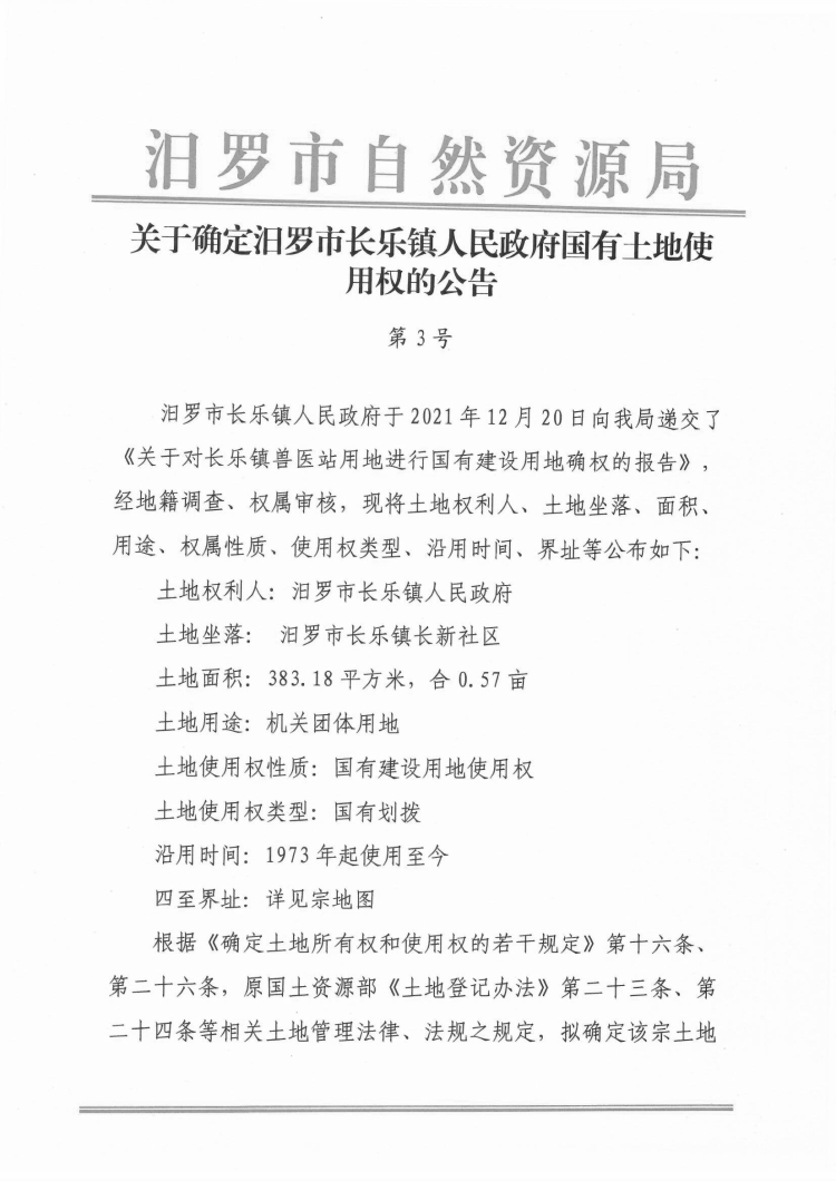 关于确定汨罗市长乐镇人民政府国有土地使用权的公告(第3号)