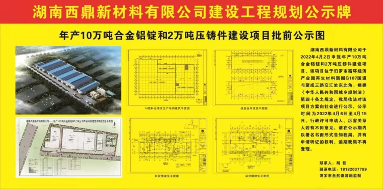 湖南西鼎新材料有限公司年产10万吨合金铝锭和2万吨压铸件建设项目批前公示