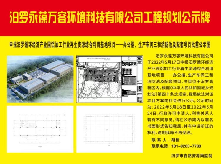 汨罗永葆万容环境科技有限公司申报汨罗循环经济产业园铝加工行业再生资源综合利用基地项目---办公楼、生产车间三和消防池及配套项目批前公示