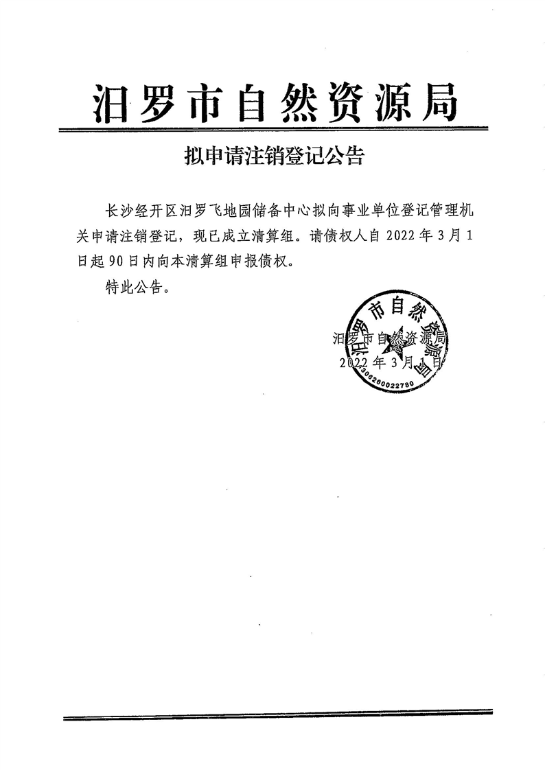 关于拟申请注销长沙经开区汨罗飞地园储备中心事业单位登记公告