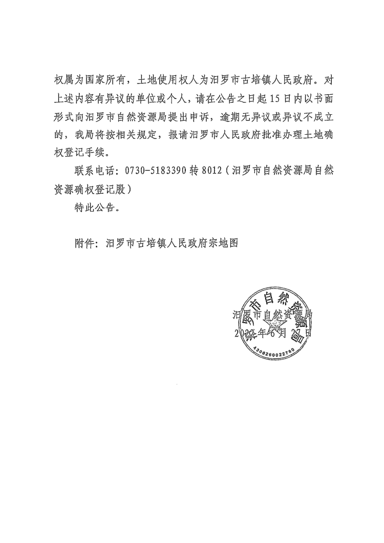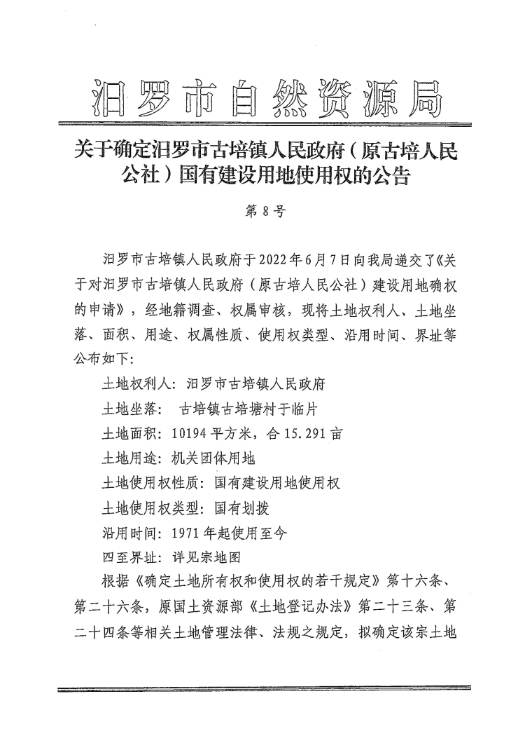关于确定汨罗市古培镇人民政府(原古培人民公社)国有建设用地使用权的公告