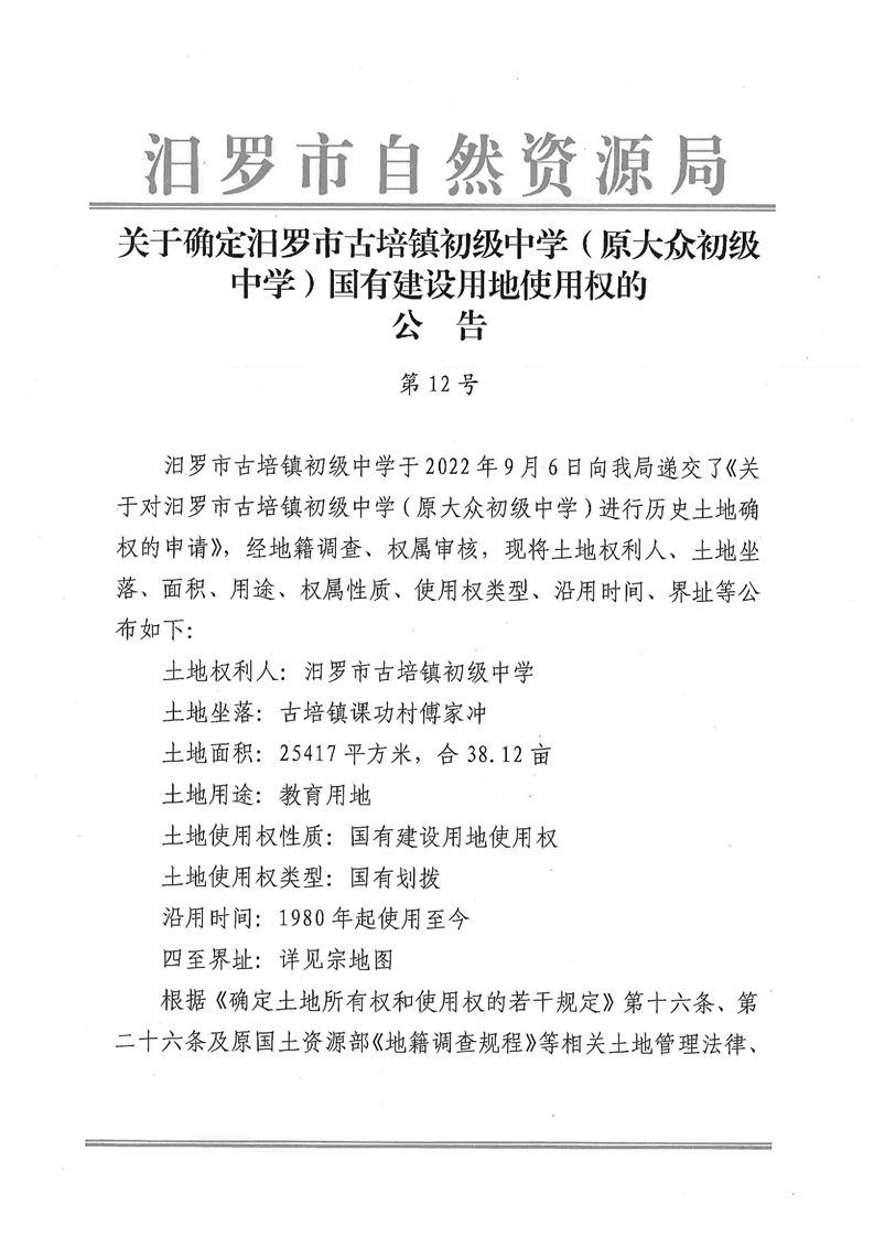 关于确定汨罗市古培镇初级中学(原大众初级中学)国有建设用地使用权的公告