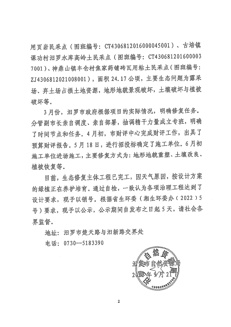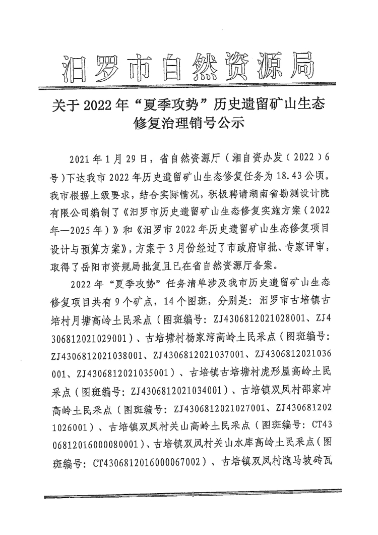 关于2022年“夏季攻势”历史遗留矿山生态修复治理销号公示