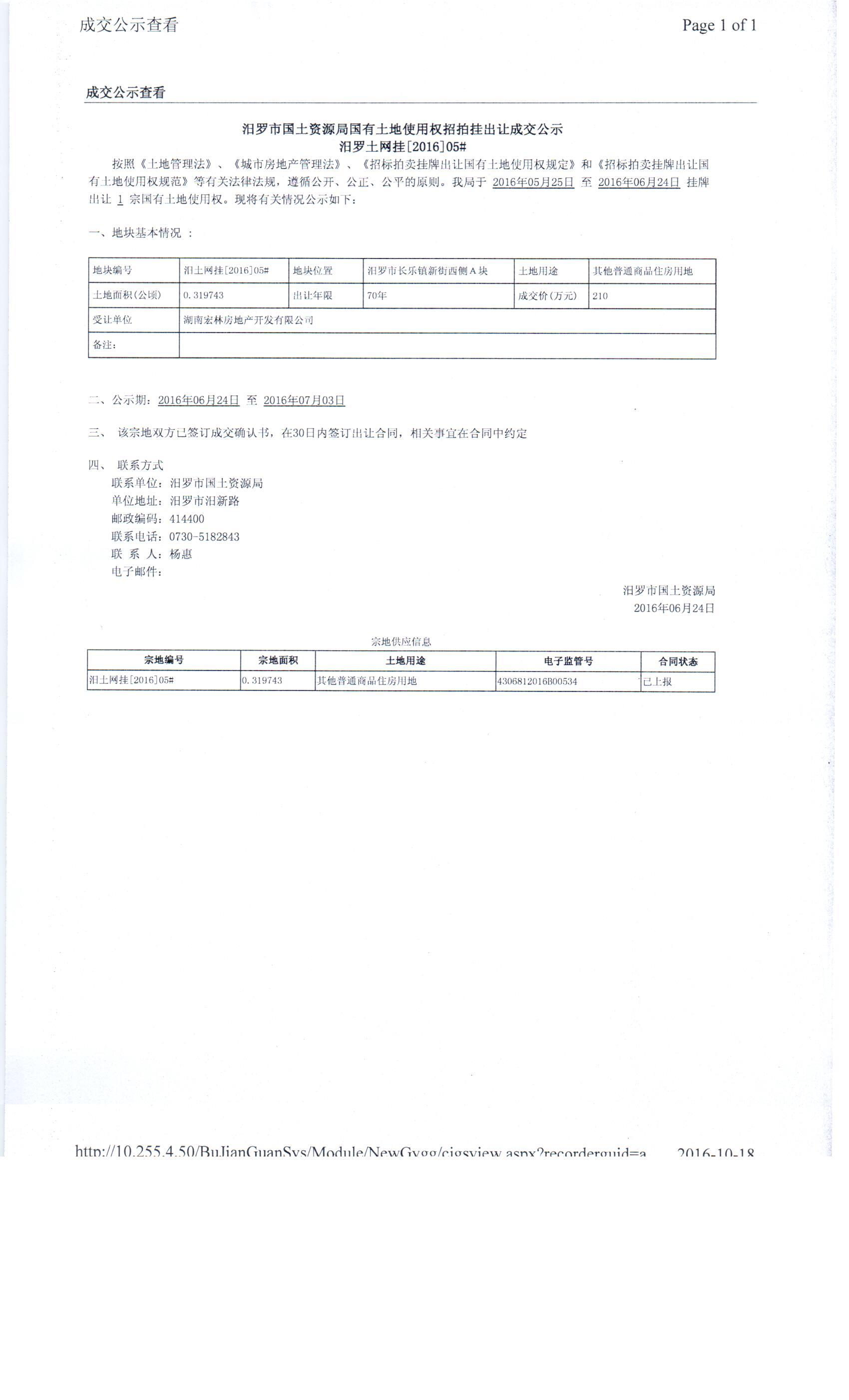 汨罗市国土资源局国有土地使用权招拍挂出让成交公示汨土网挂【2016】05#
