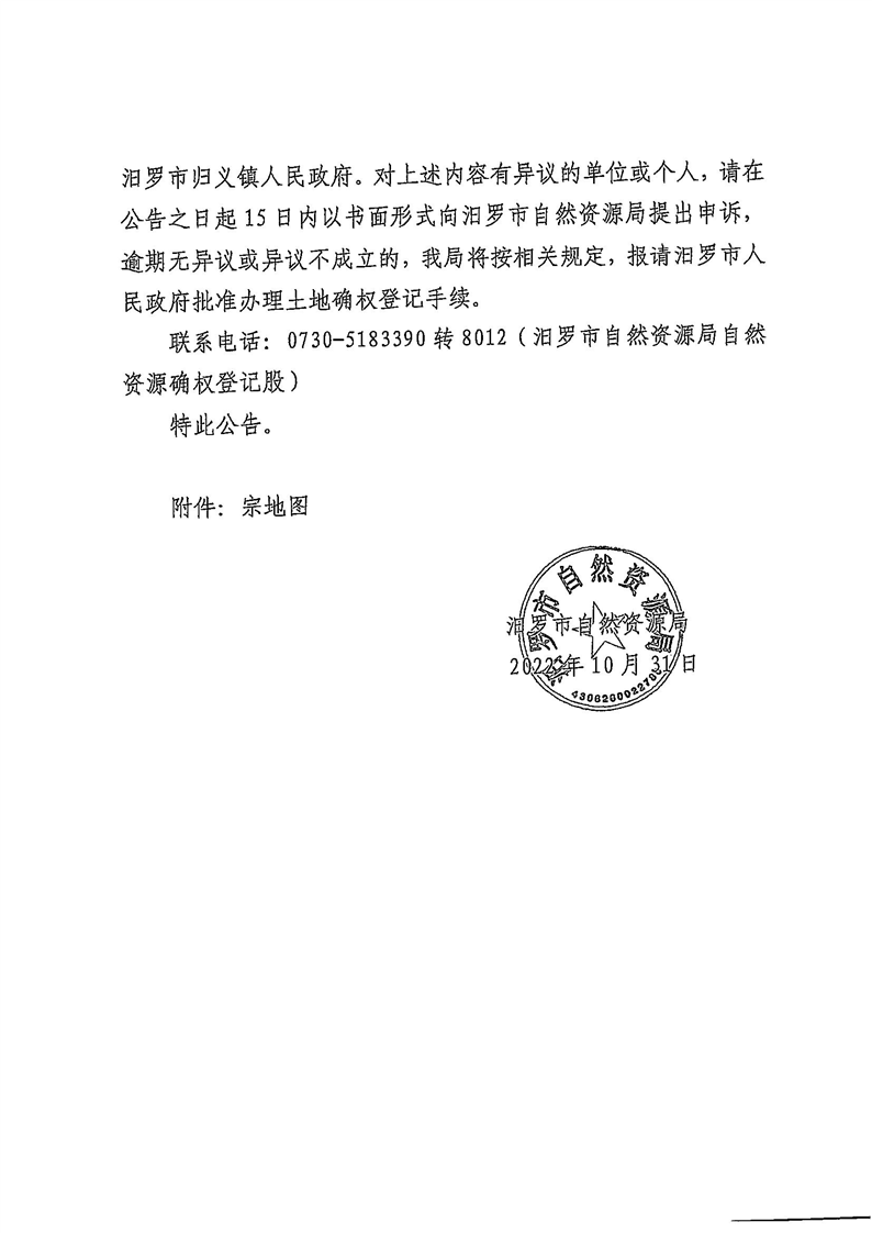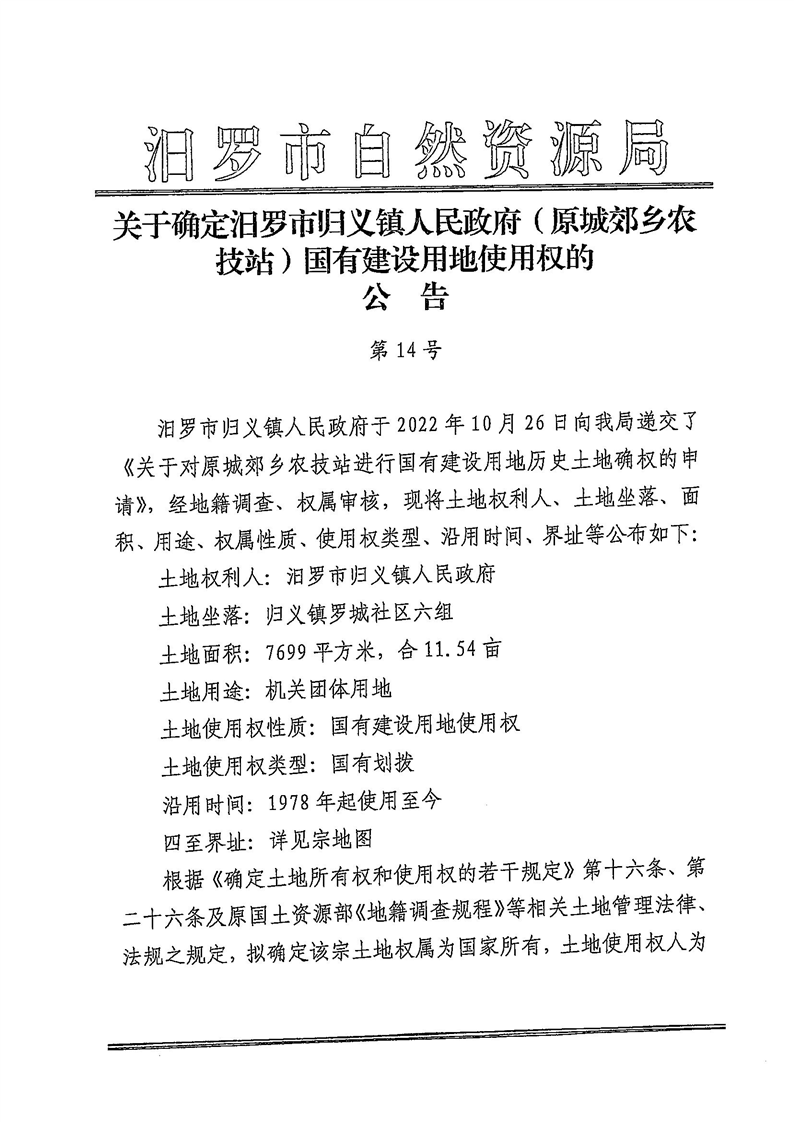 关于确定汨罗市归义镇人民政府(原城郊乡农技站)国有建设用地使用权的公告