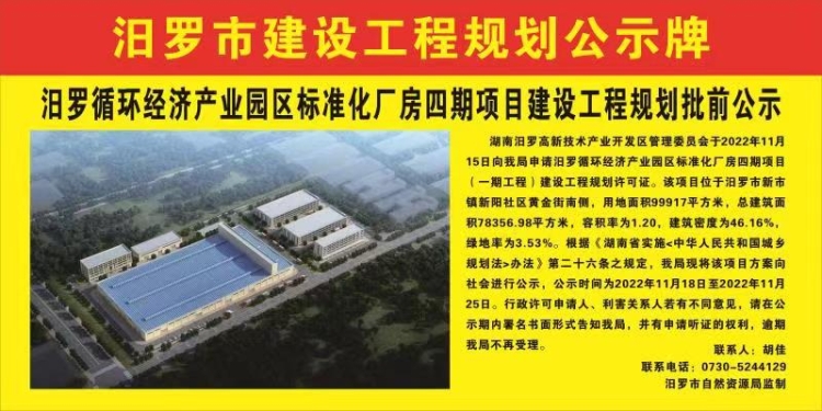 汨罗循环经济产业园区标准化厂房四期项目建设工程规划批前公示