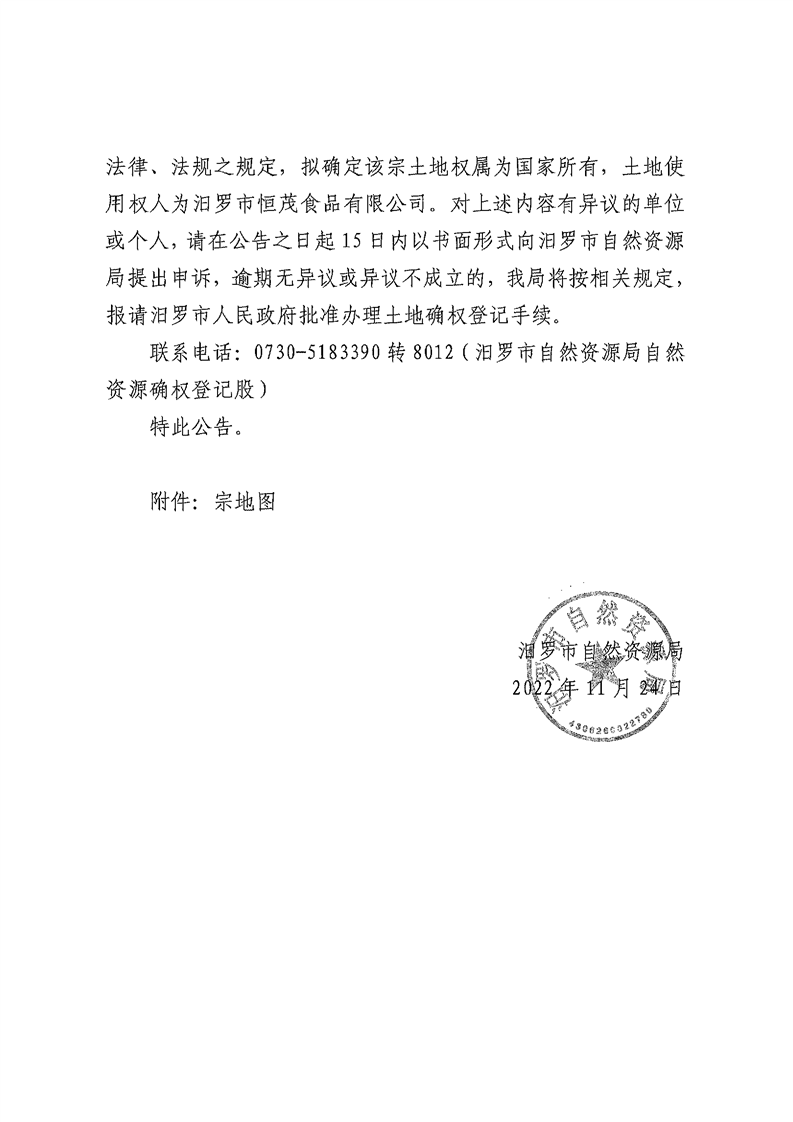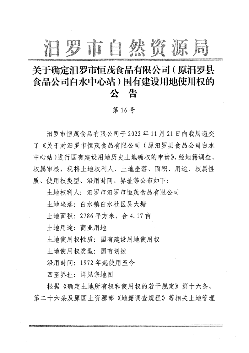 关于确定汨罗市恒茂食品有限公司(原汨罗县食品公司白水中心站)国有建设用地使用权的公告