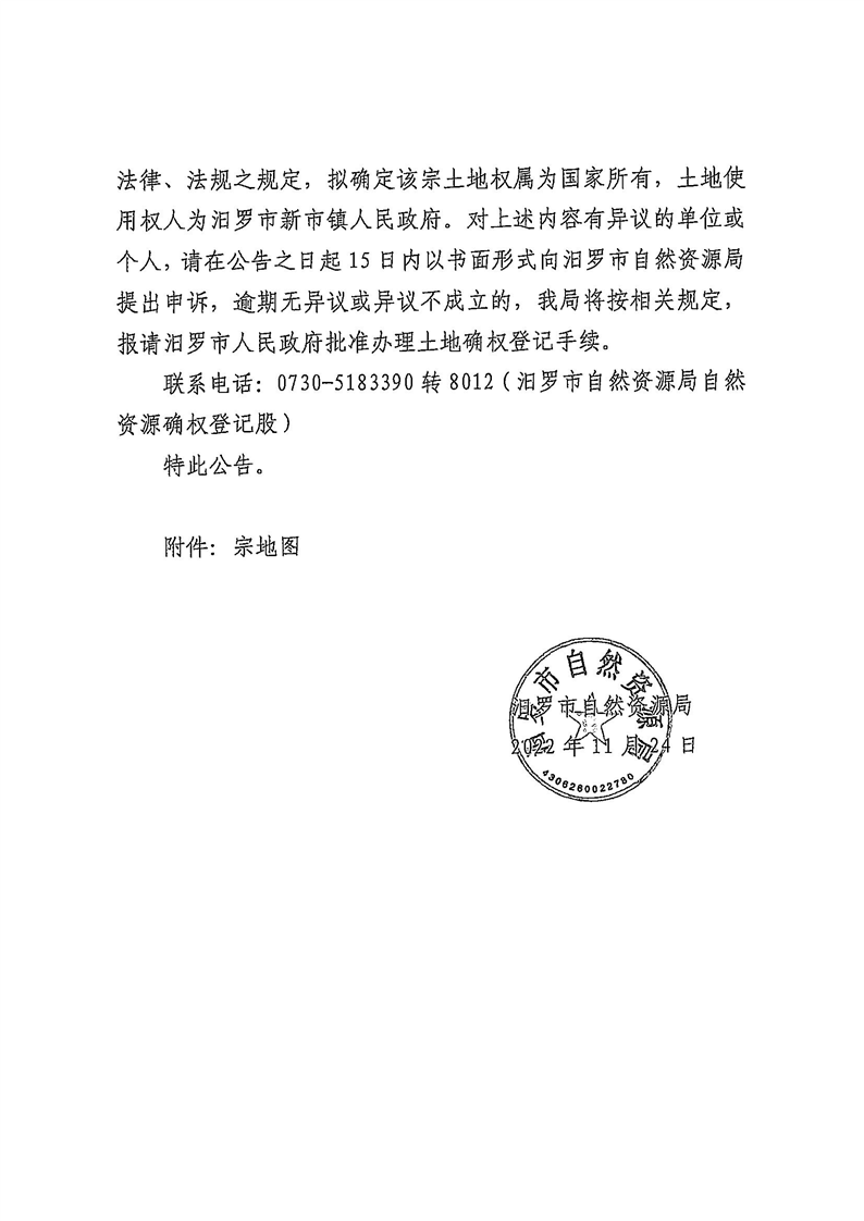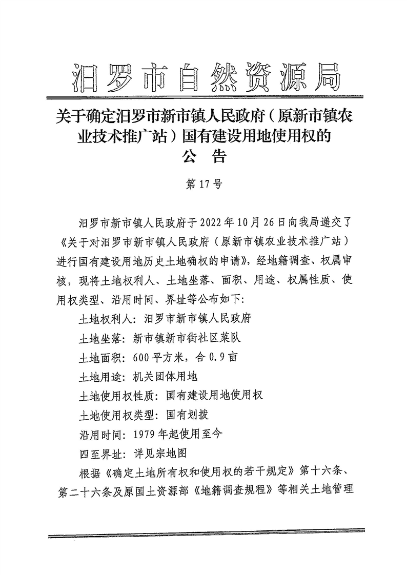 关于确定汨罗市新市镇人民政府(原新市镇农业技术推广站)国有建设用地使用权的公告