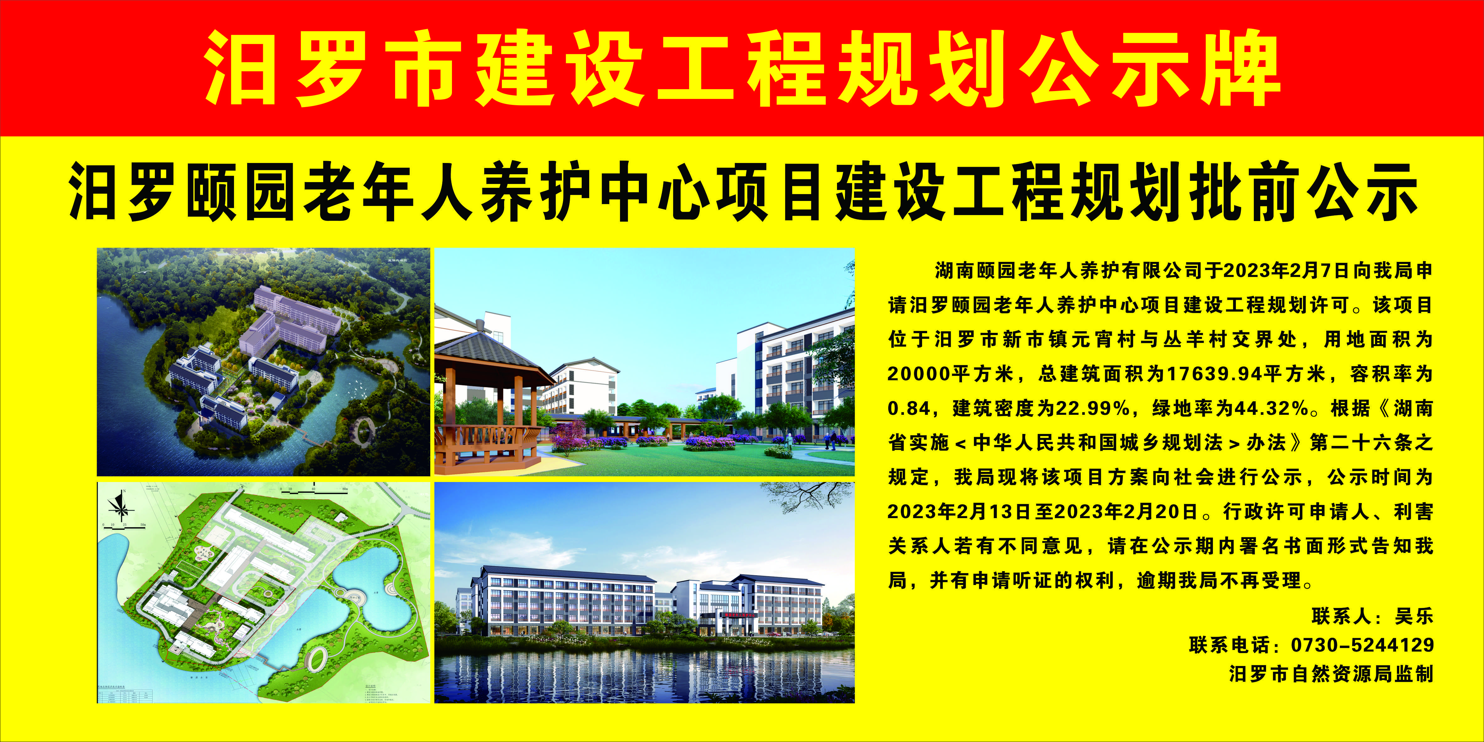 汨罗市颐园老年人养护中心项目建设工程规划批前公示
