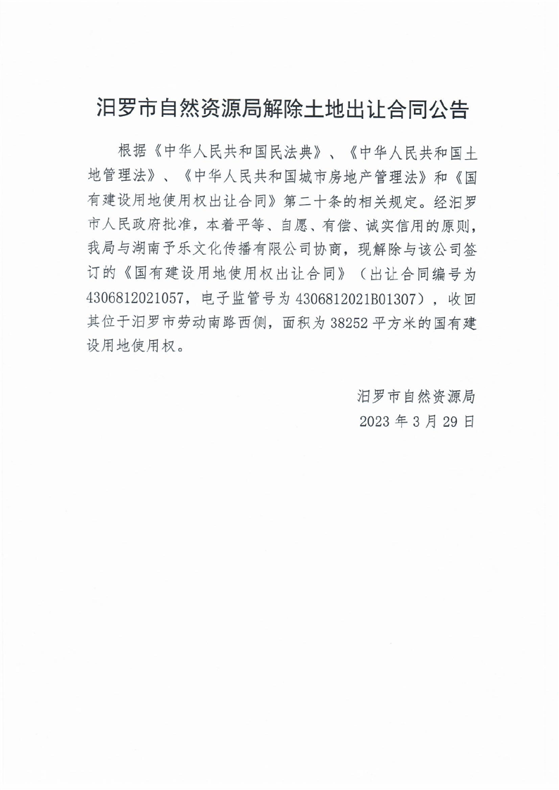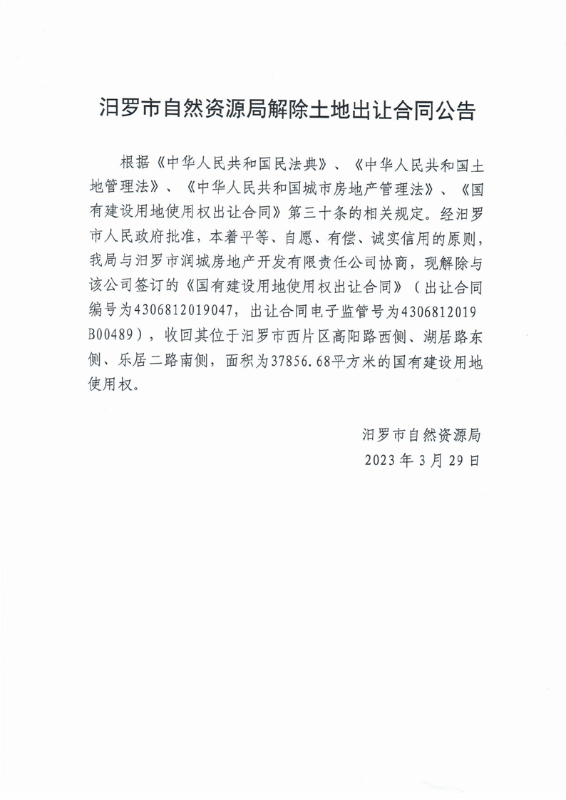 汨罗市自然资源局解除(润城房地产开发有限公司、予乐文化传播有限公司)土地出让合同公告
