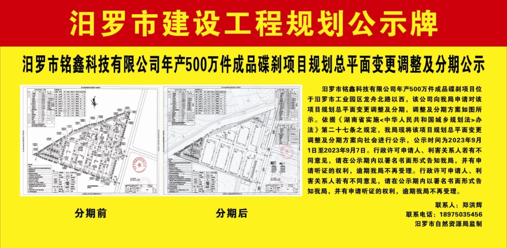 汨罗市铭鑫科技有限公司年产500万件碟刹项目规划总平面变更调整及分期公示