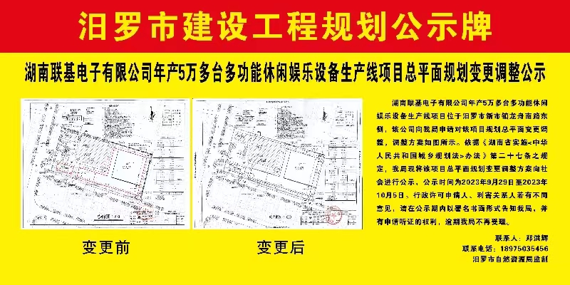 湖南联基电子有限公司年产5万多台多功能休闲娱乐设备生产线项目总平面规划变更调整公示