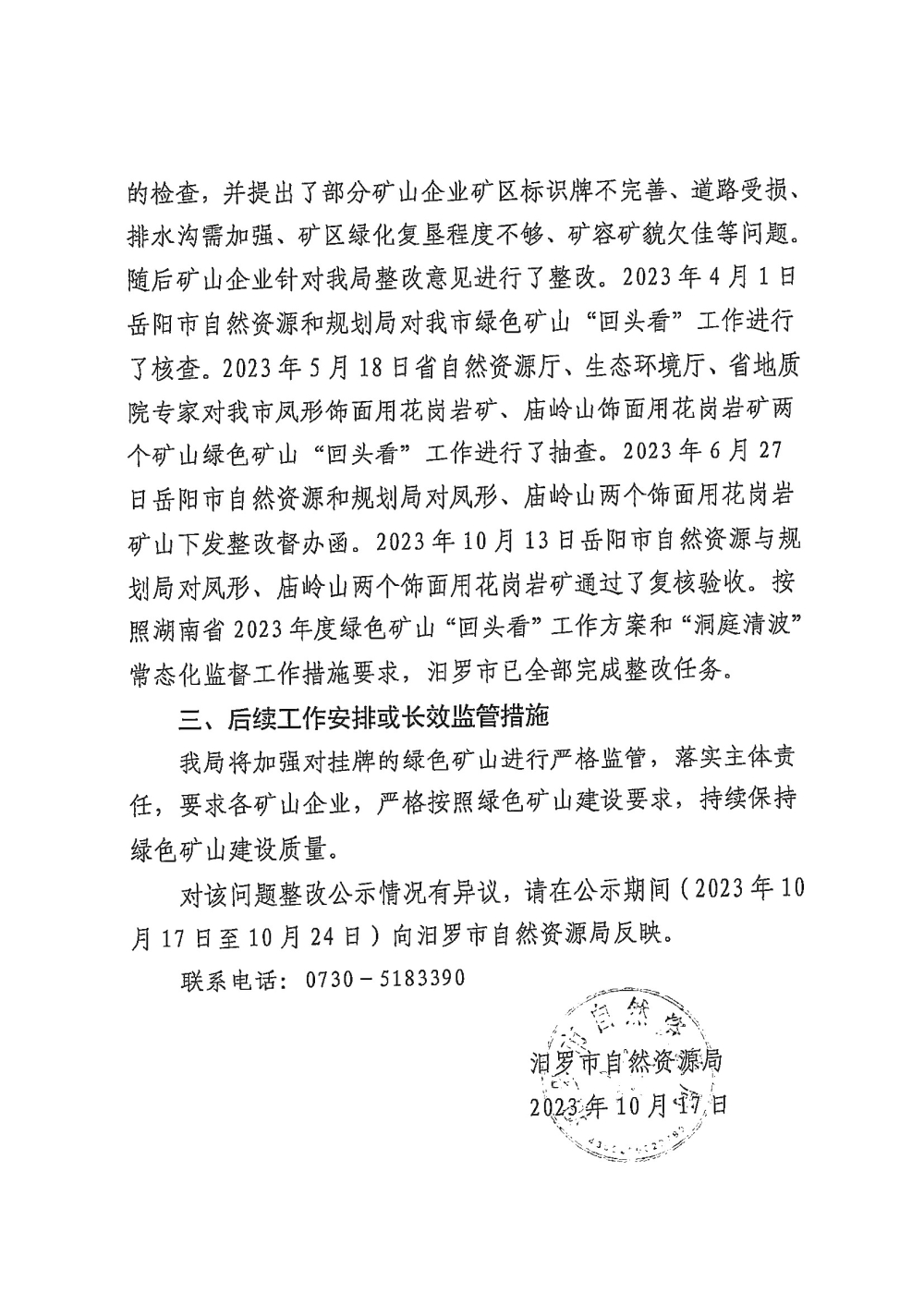 湖南省2023年绿色矿山“回头看”问题整改情况公示