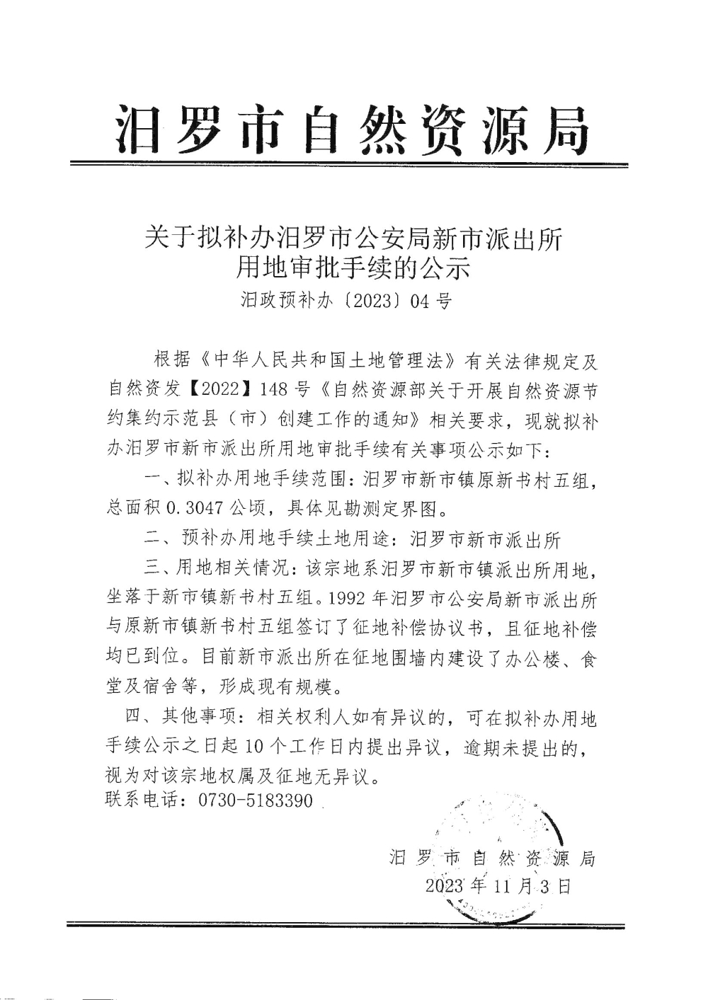 关于拟补办汨罗市公安局新市派出所用地审批手续的公示