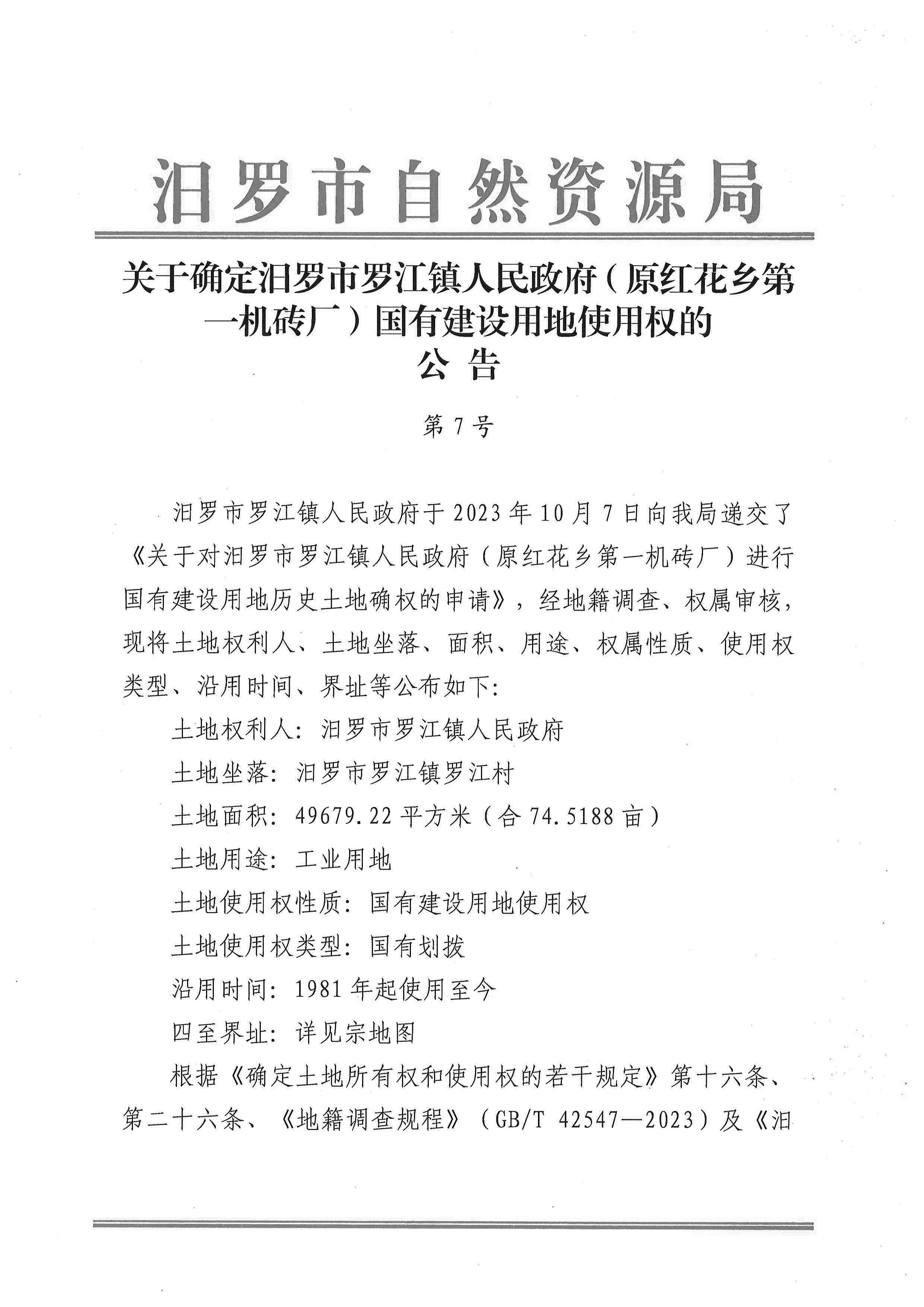关于确定汨罗市罗江镇人民政府(原红花乡第一机砖厂)国有建设用地使用权的公告
