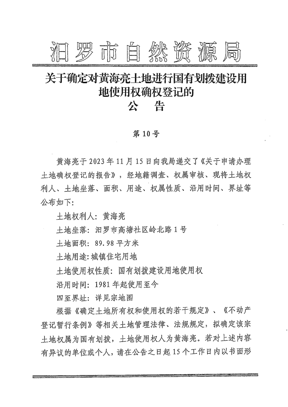 关于确定对黄海亮士地进行国有划拨建设用地使用权确权登记的公告