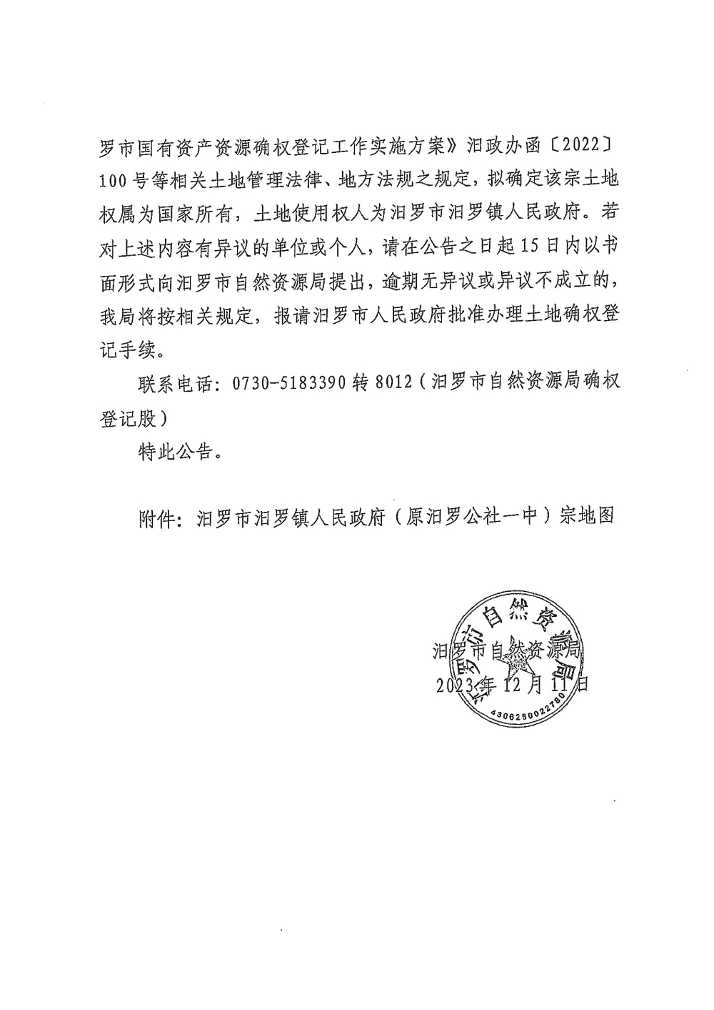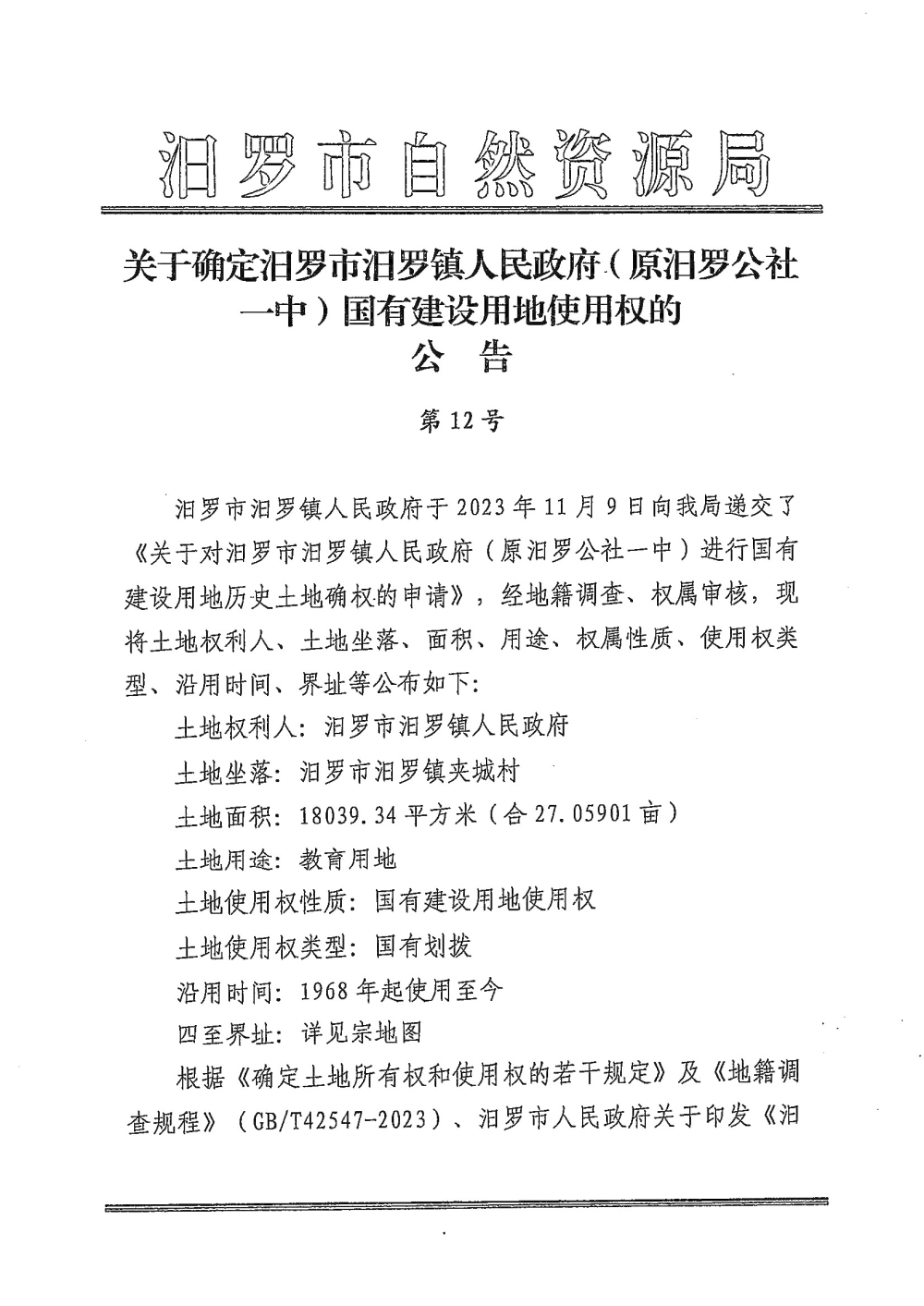 关于确定汨罗市汨罗镇人民政府(原汨罗公社一中)国有建设用地使用权的公告