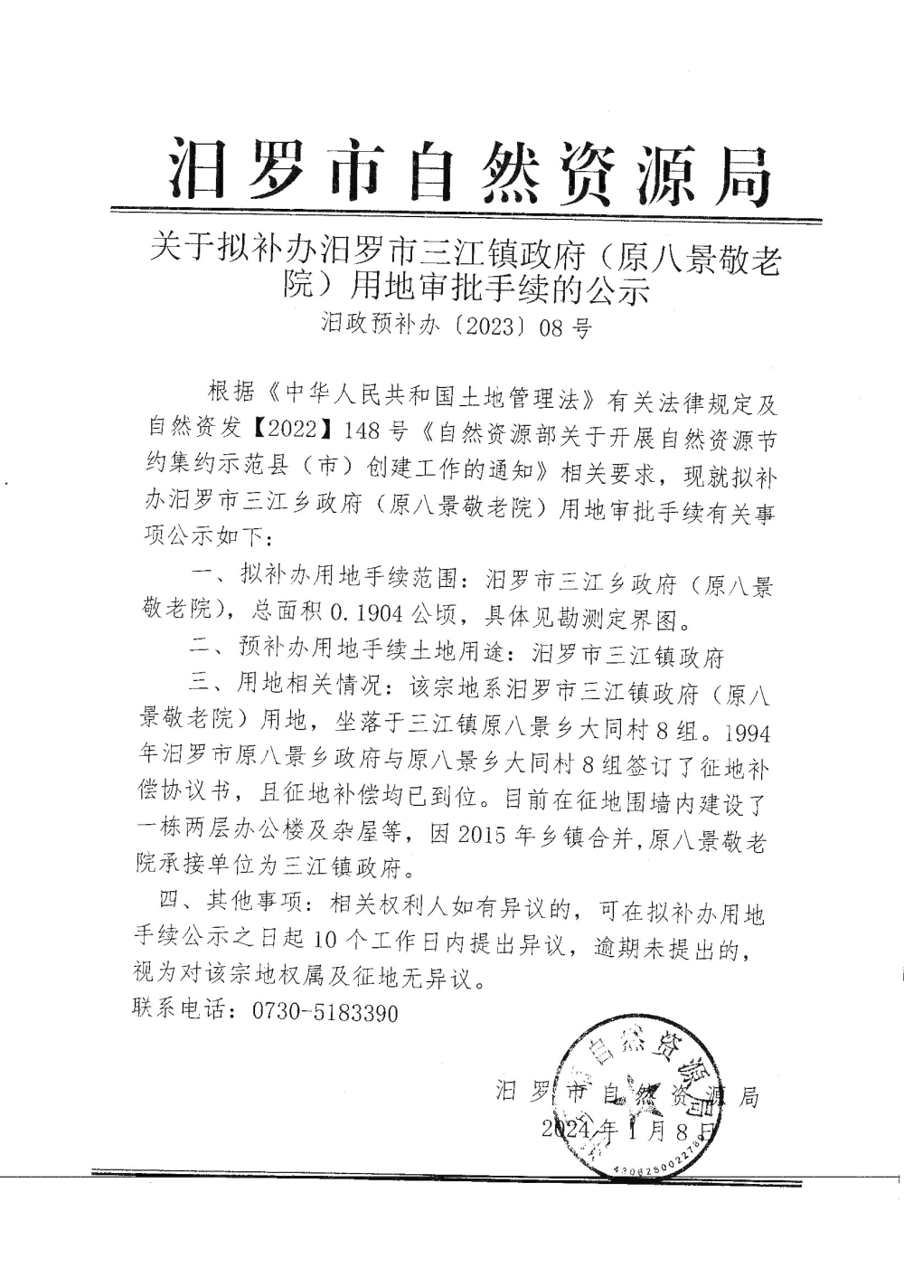 关于拟补办汨罗市三江镇政府(原八景敬老院)用地审批手续的公示