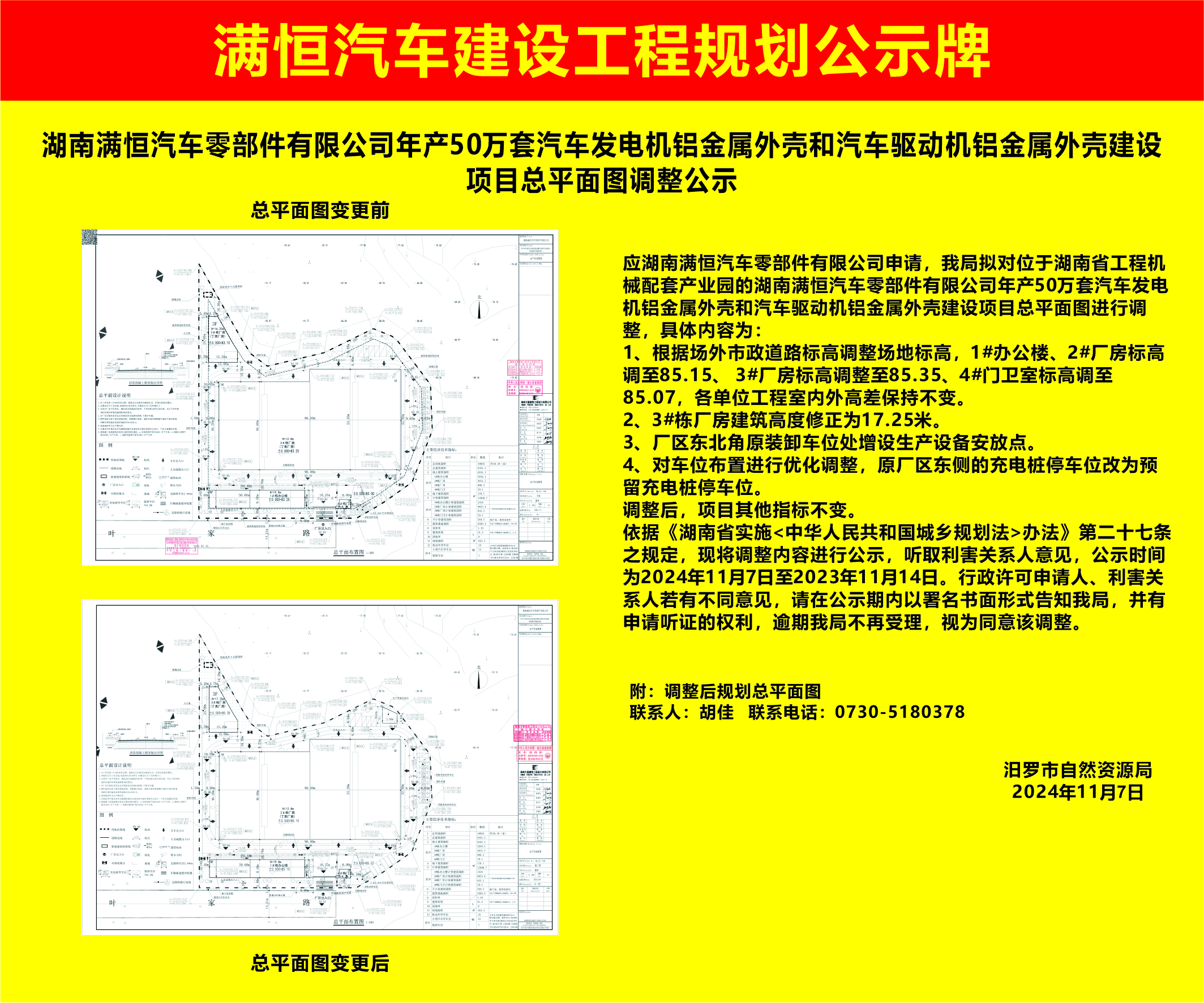 湖南满恒汽车零部件有限公司年产50万套汽车发电机铝金属外壳和汽车驱动机铝金属外壳建设项目总平面图调整公示