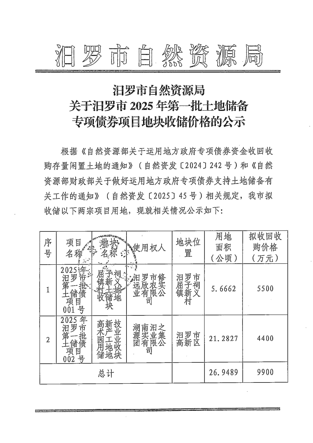关于汨罗市2025年第一批土地储备专项债券项目地块收储价格的公示