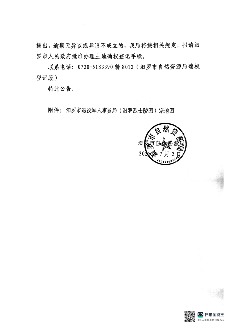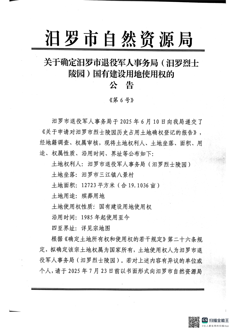 关于确定汨罗市退役军人事务局(汨罗烈士陵园)国有建设用地使用权的公告