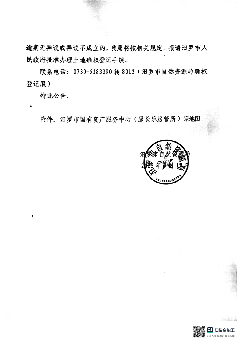 关于确定汨罗市国有资产服务中心(原长乐房管所)国有建设用地使用权的公告