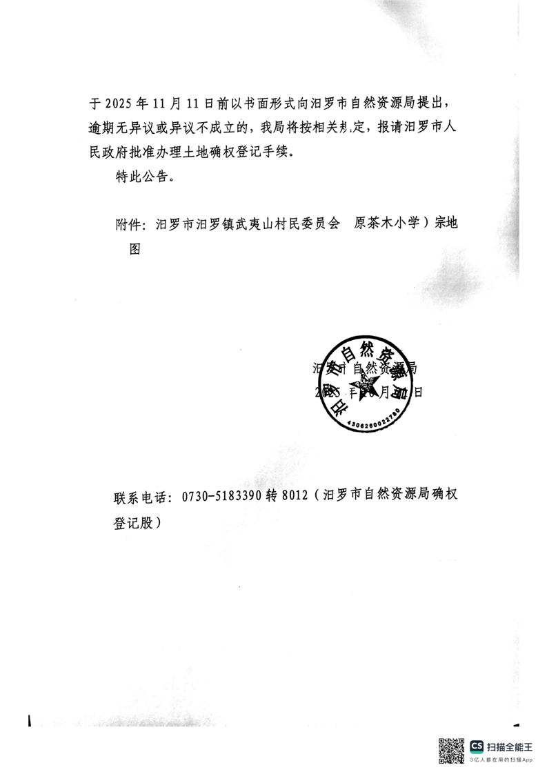 关于确定汨罗市汨罗镇武夷山村民委员会(原茶木小学)集体建设用地使用权的公告