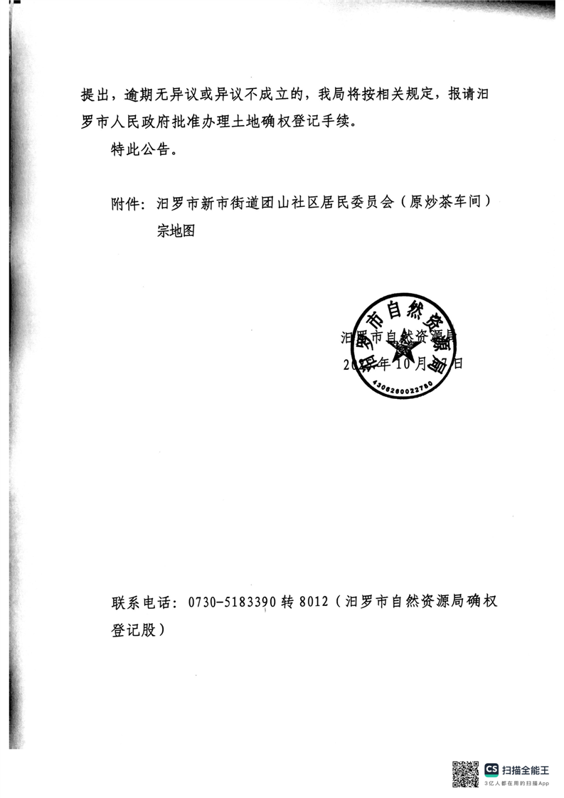 关于确定汨罗市新市街道团山社区(原炒茶车间)集体建设用地使用权的公告