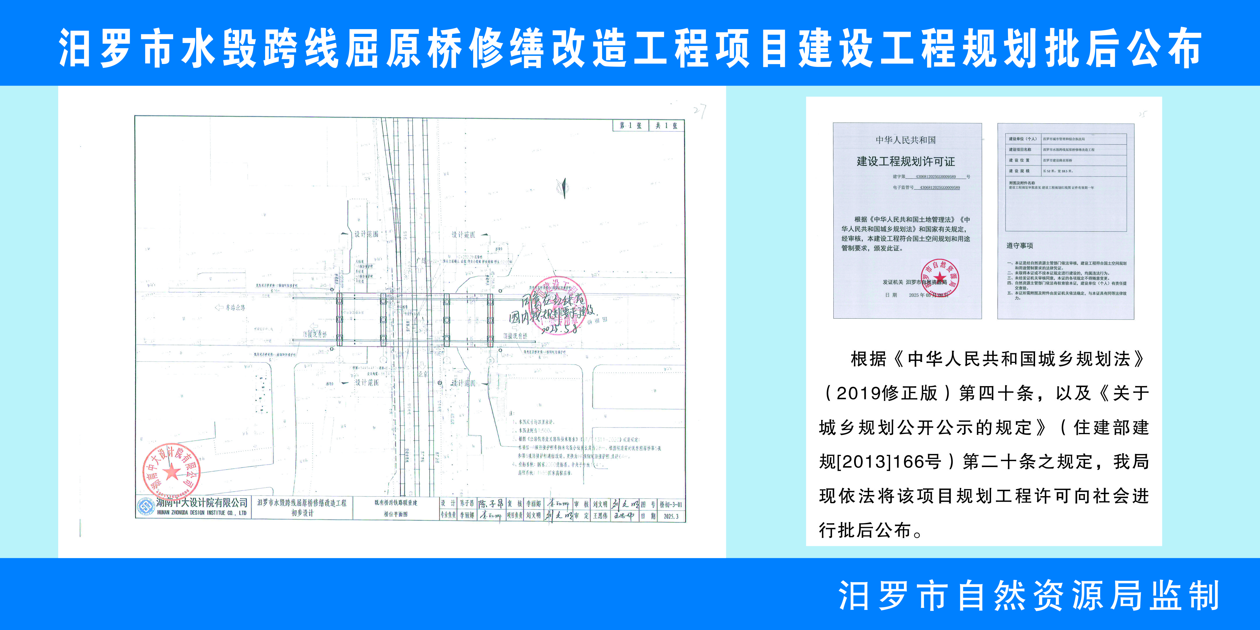 汨罗市水毁跨线屈原桥修缮改造工程项目建设工程规划批后公布
