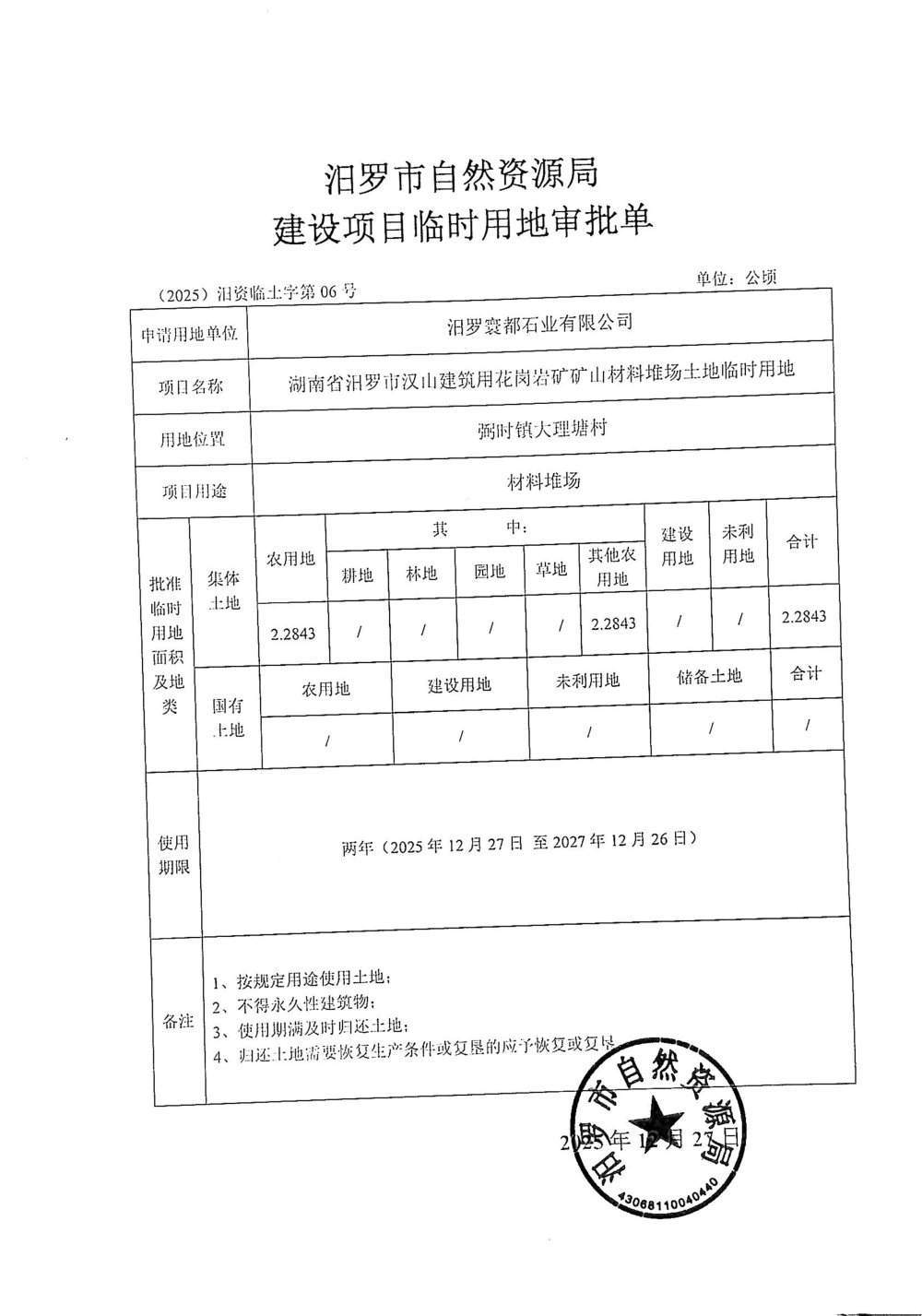 湖南省汨罗市汉山建筑用花岗岩矿矿山材料堆场土地临时用地审批单