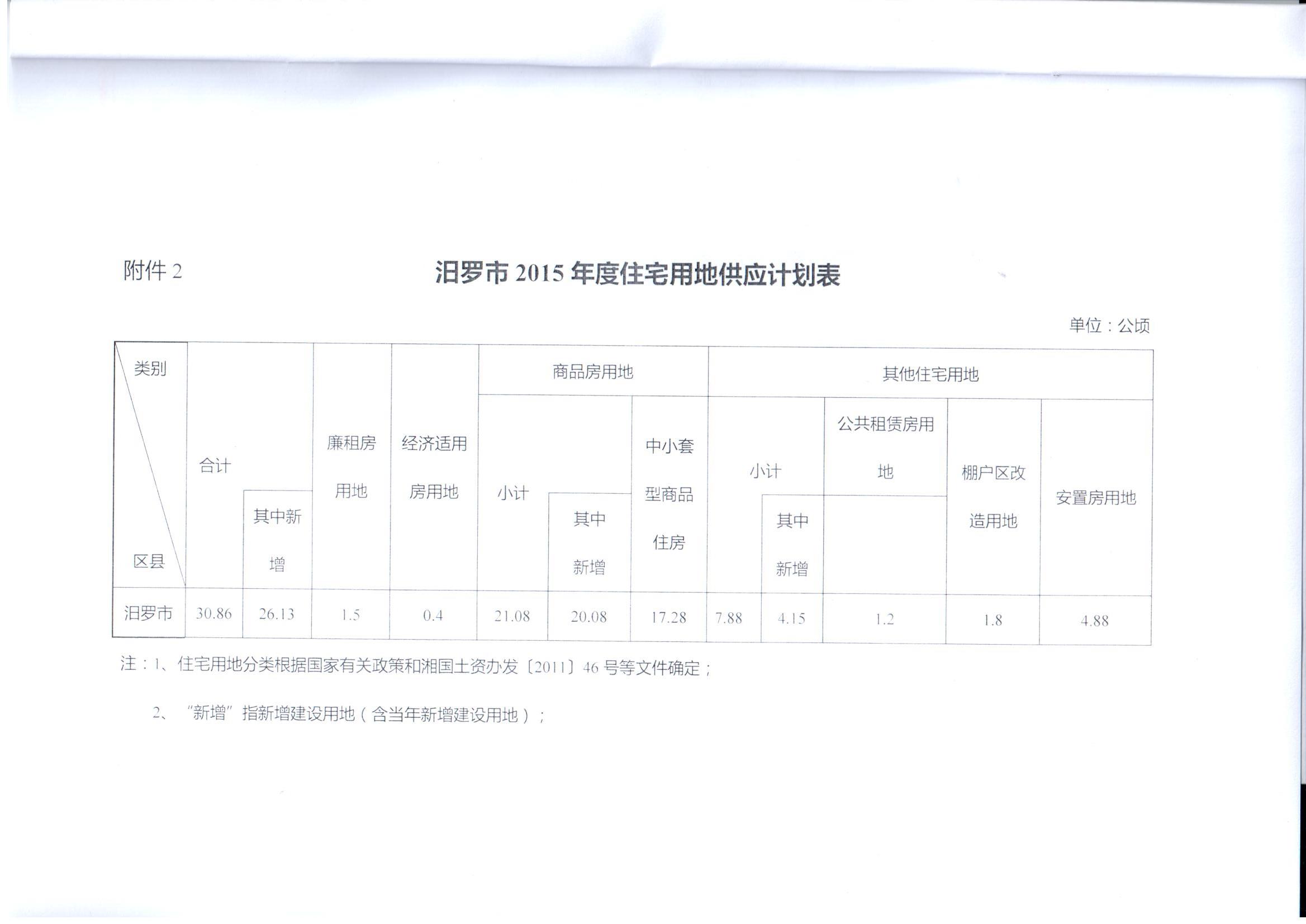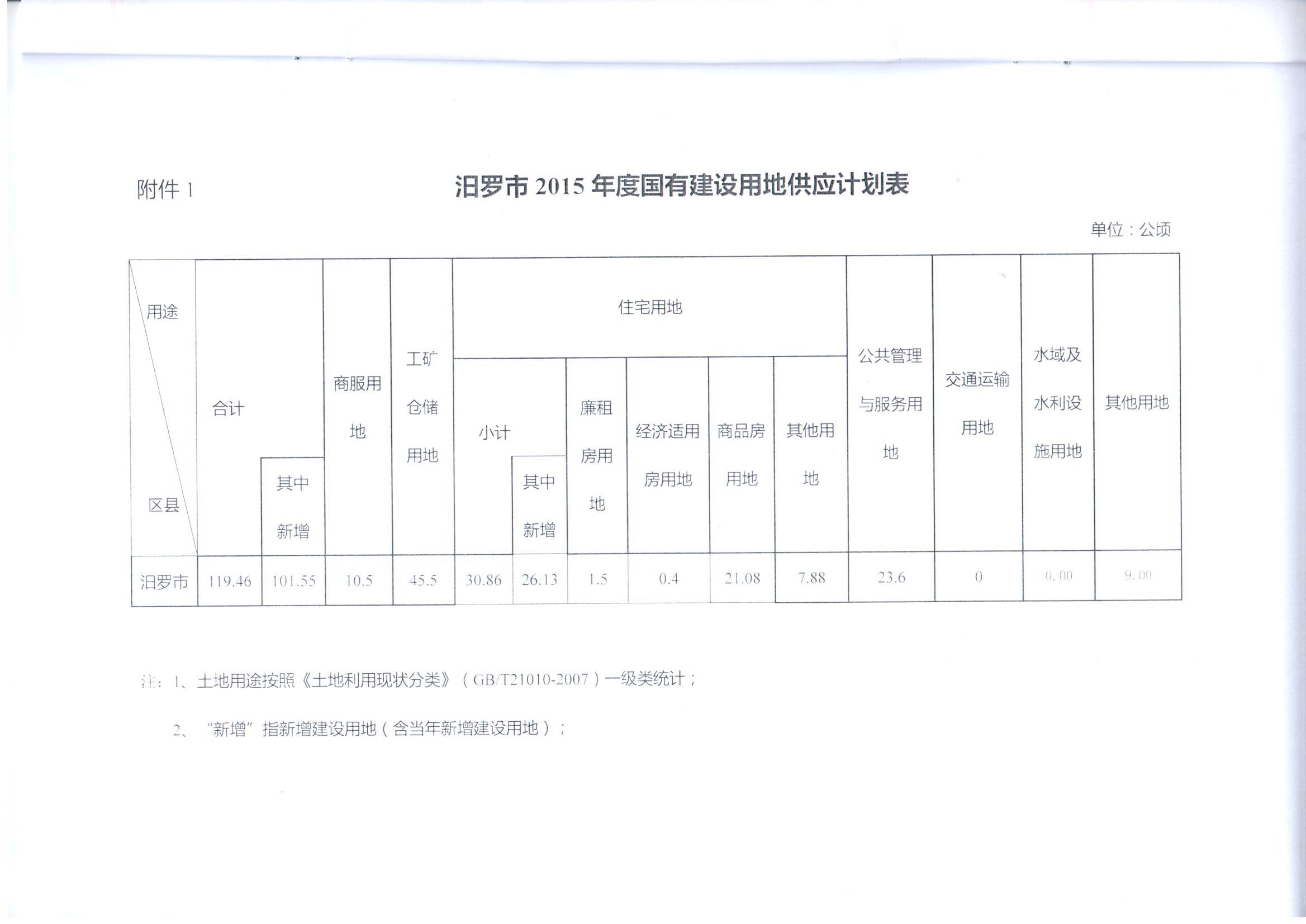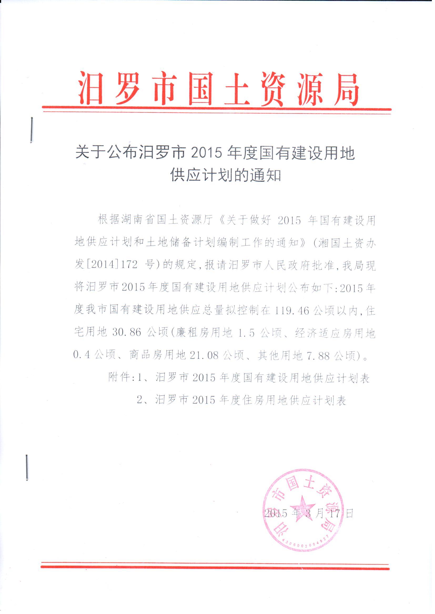 关于公布汨罗市2015年度国有建设用地供应计划的通知