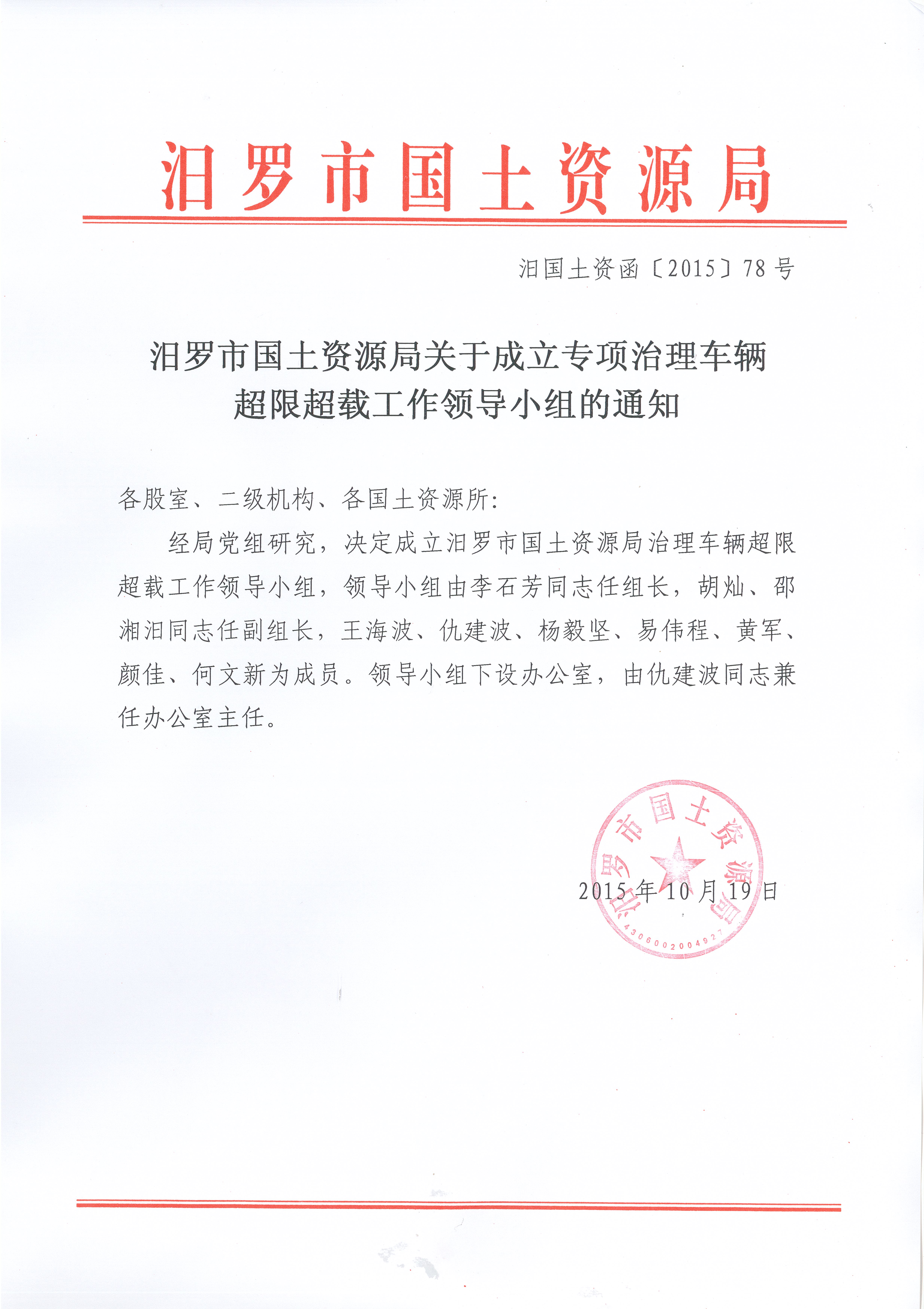 汨罗市国土资源局关于成立专项治理车辆超限超载工作领导小组的通知