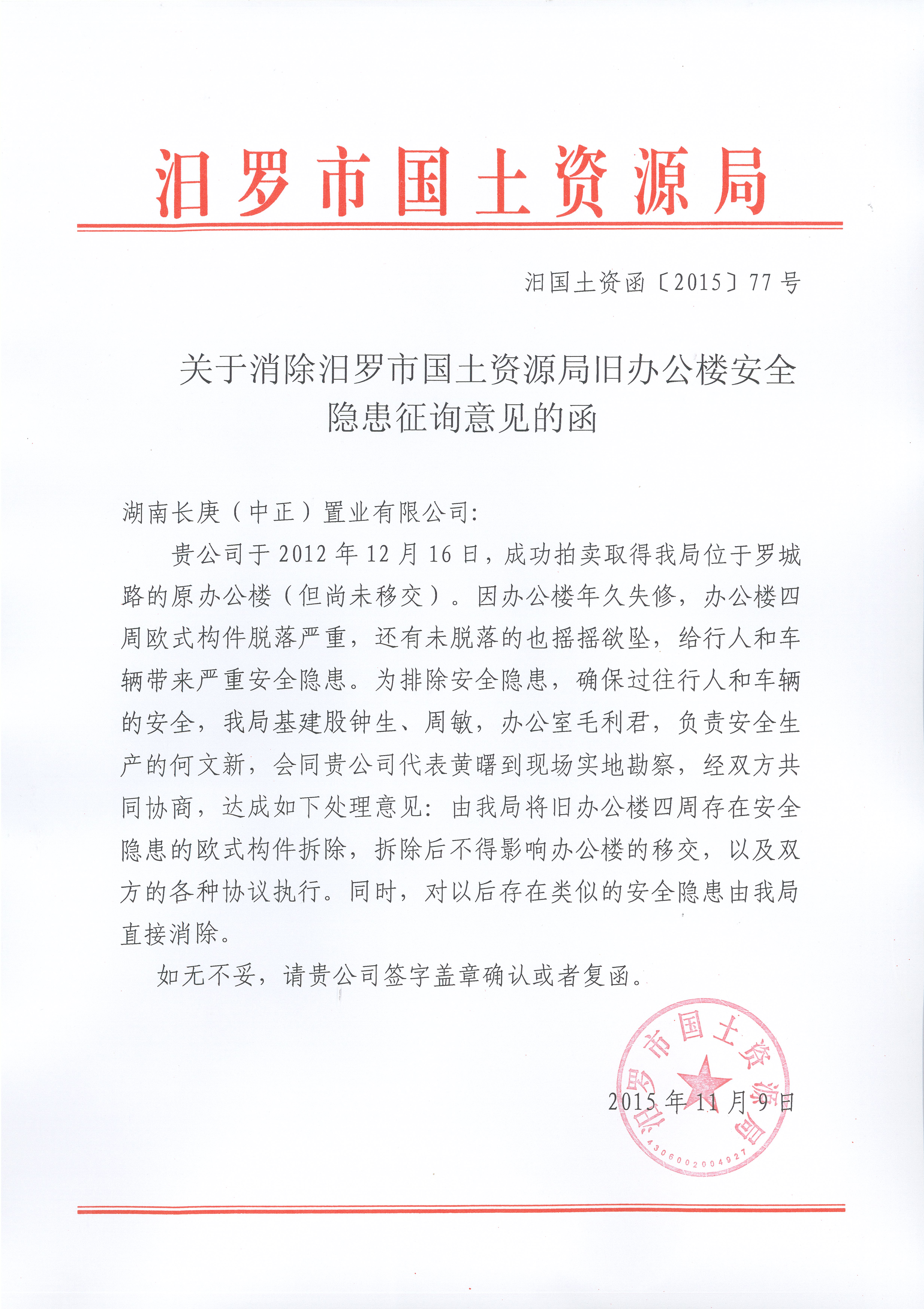 关于消除汨罗市国土资源局旧办公楼安全隐患征询意见的函