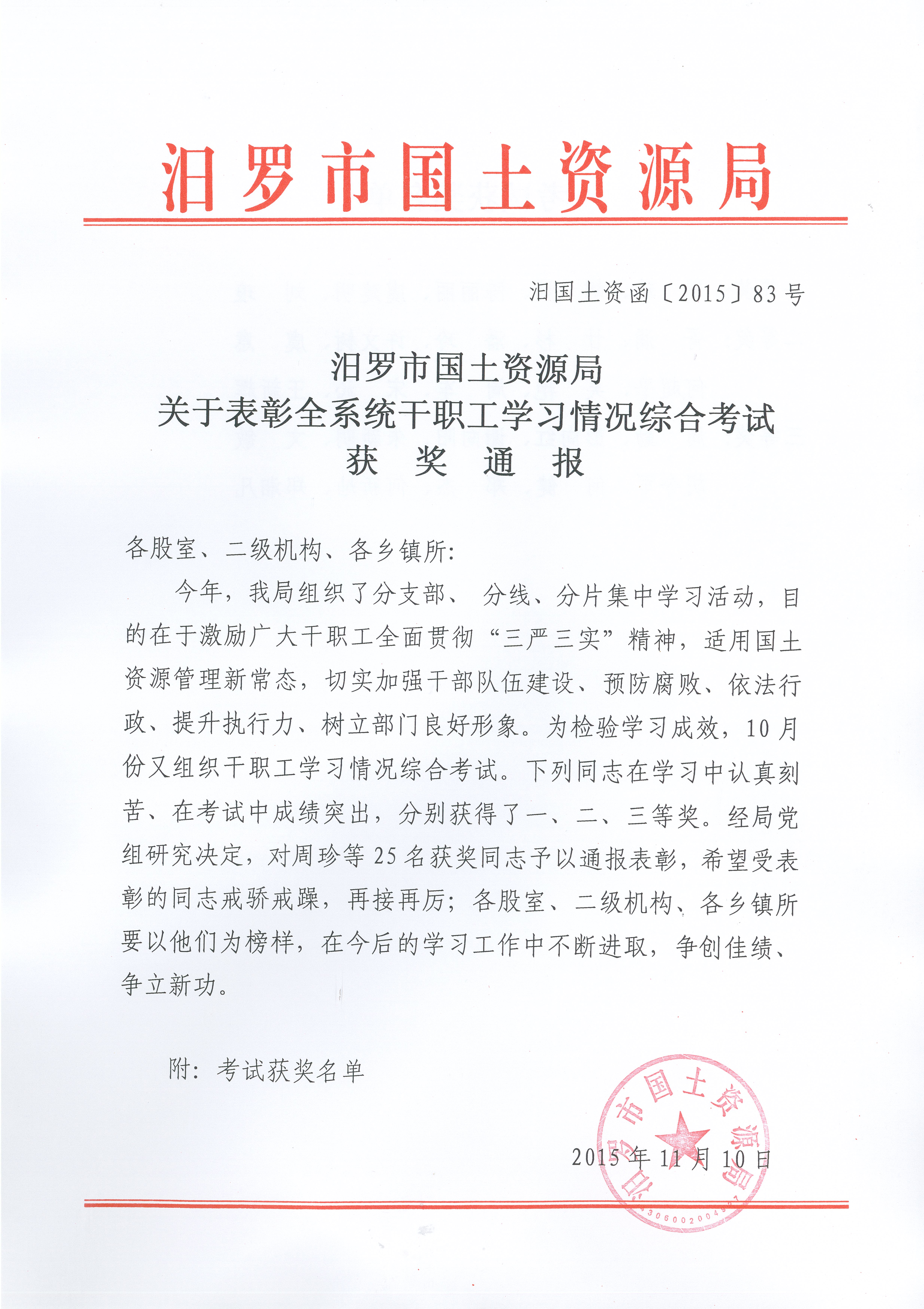 汨罗市国土资源局关于表彰全系统干职工学习情况综合考试获奖通报