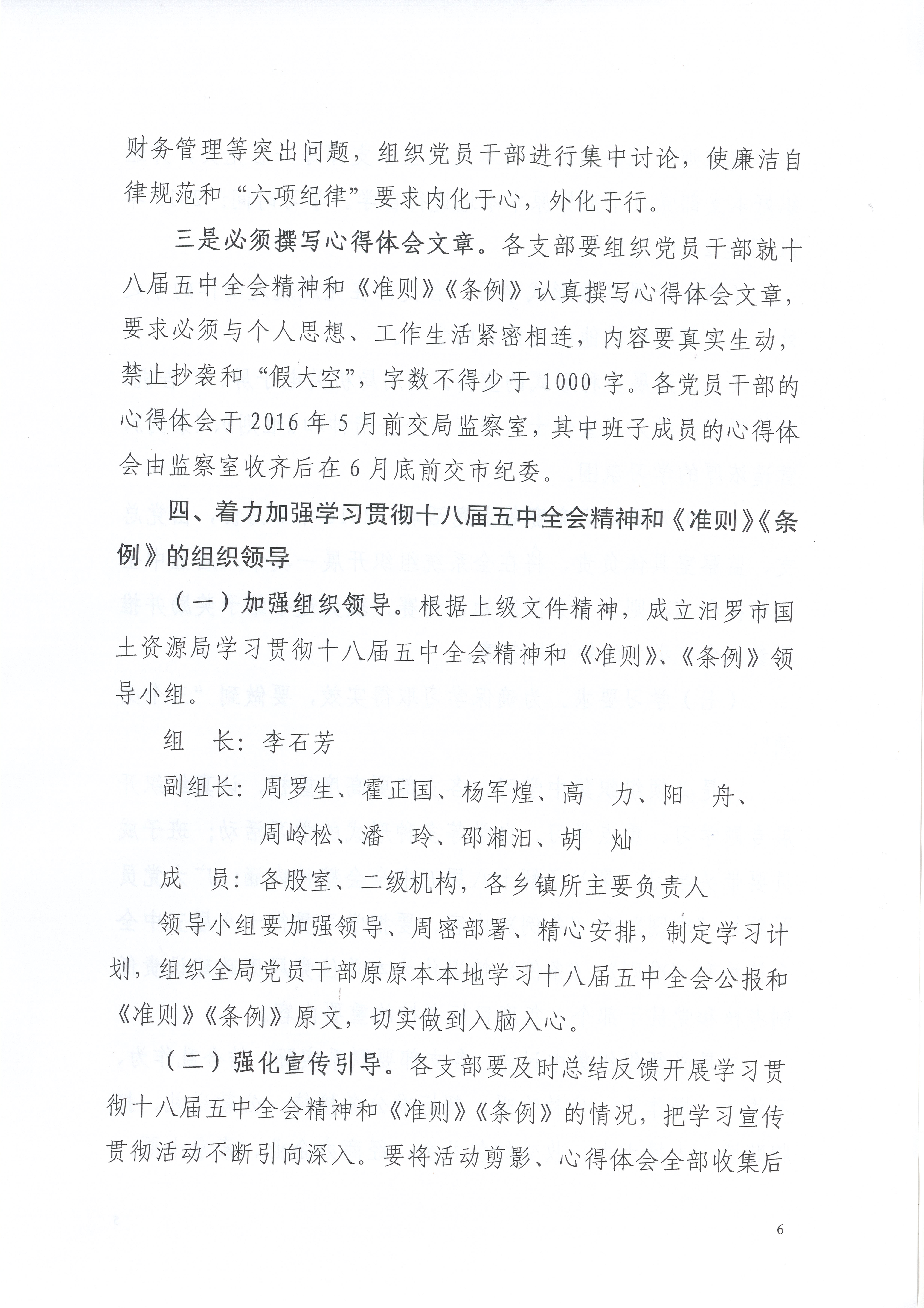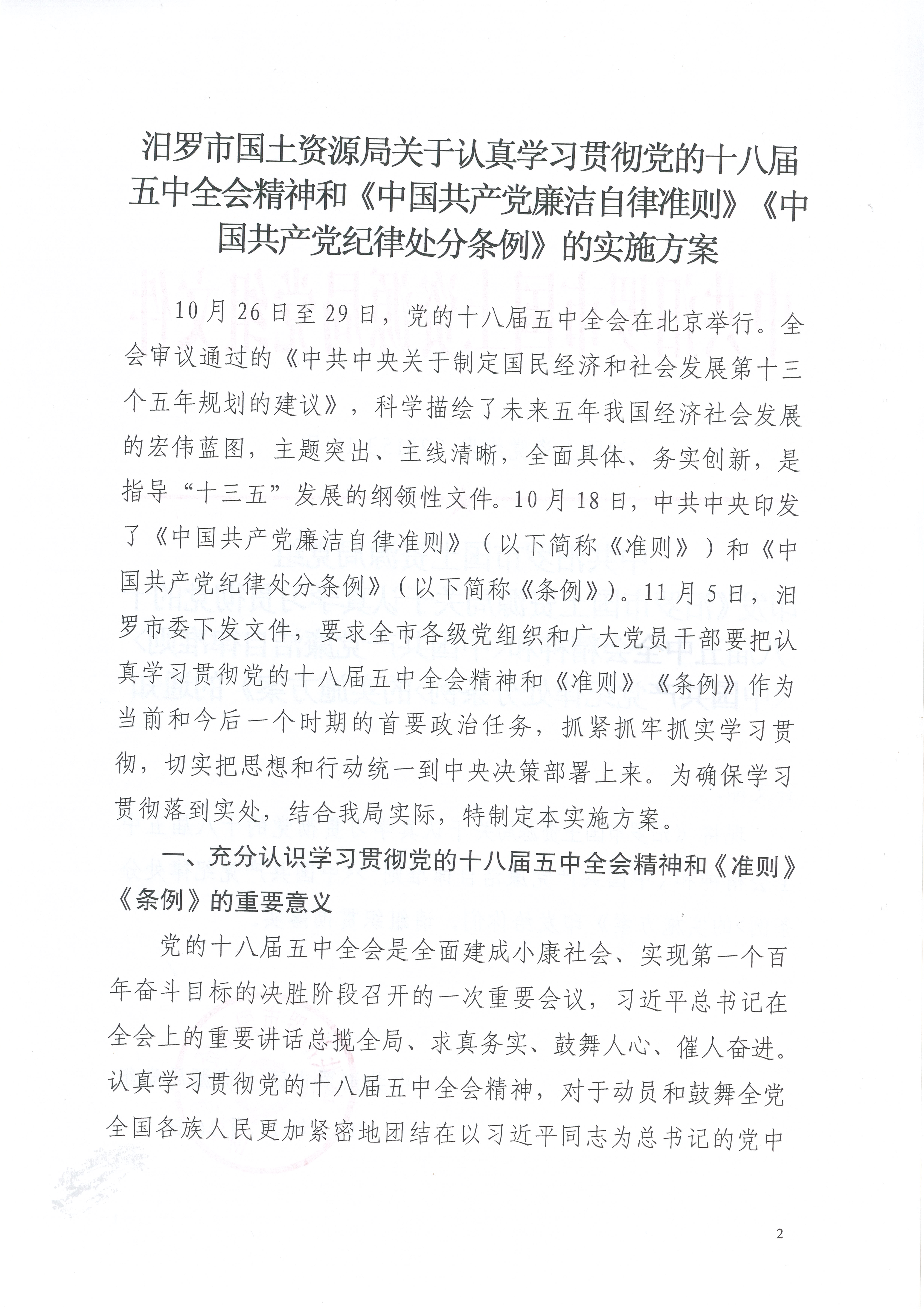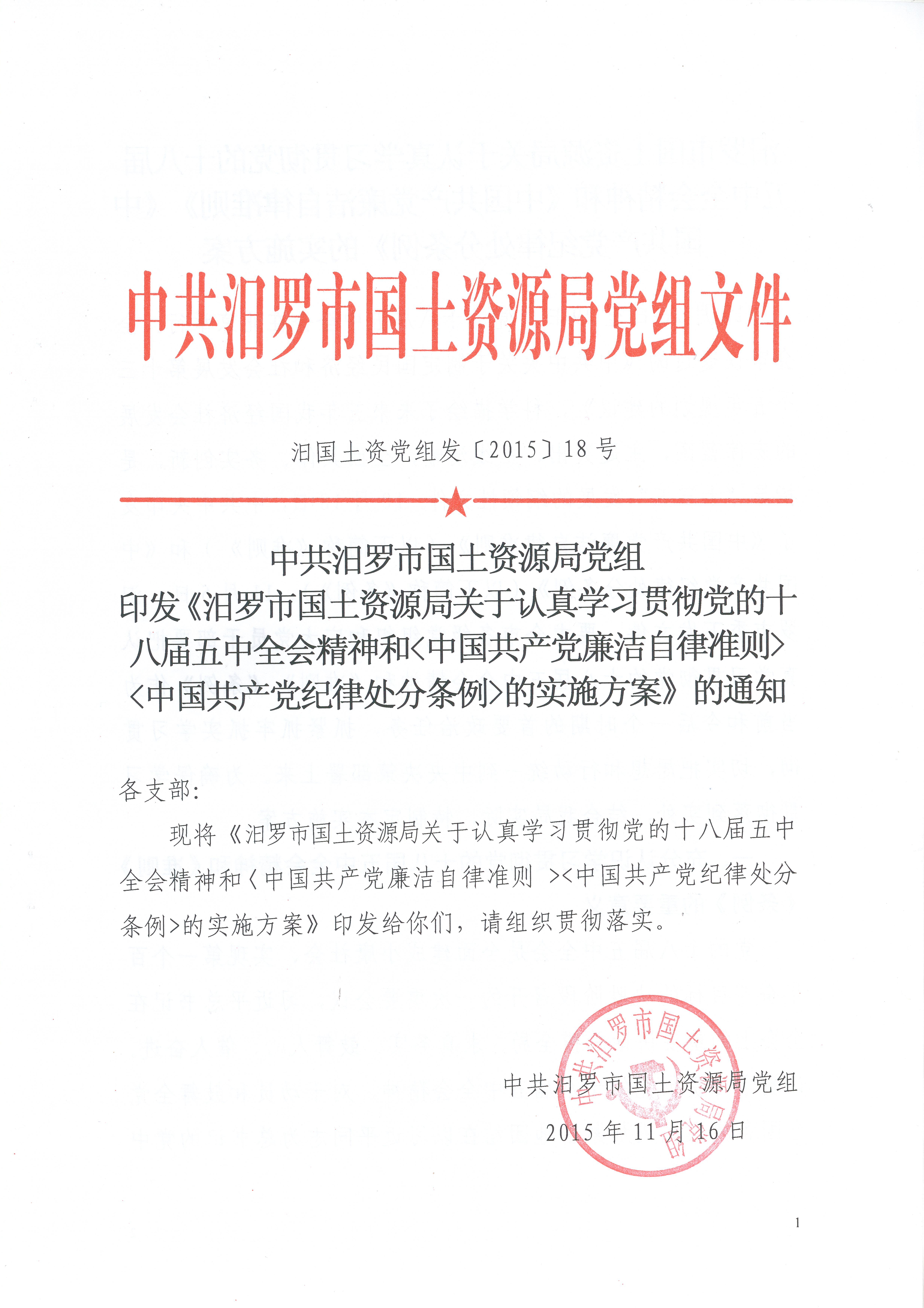 中共汨罗市国土资源局党组 印发《汨罗市国土资源局关于认真学习贯彻党的十八届五中全会精神和<中国共产党廉洁自律准则> <中国共产党纪律处分条例>的实施方案》的通知