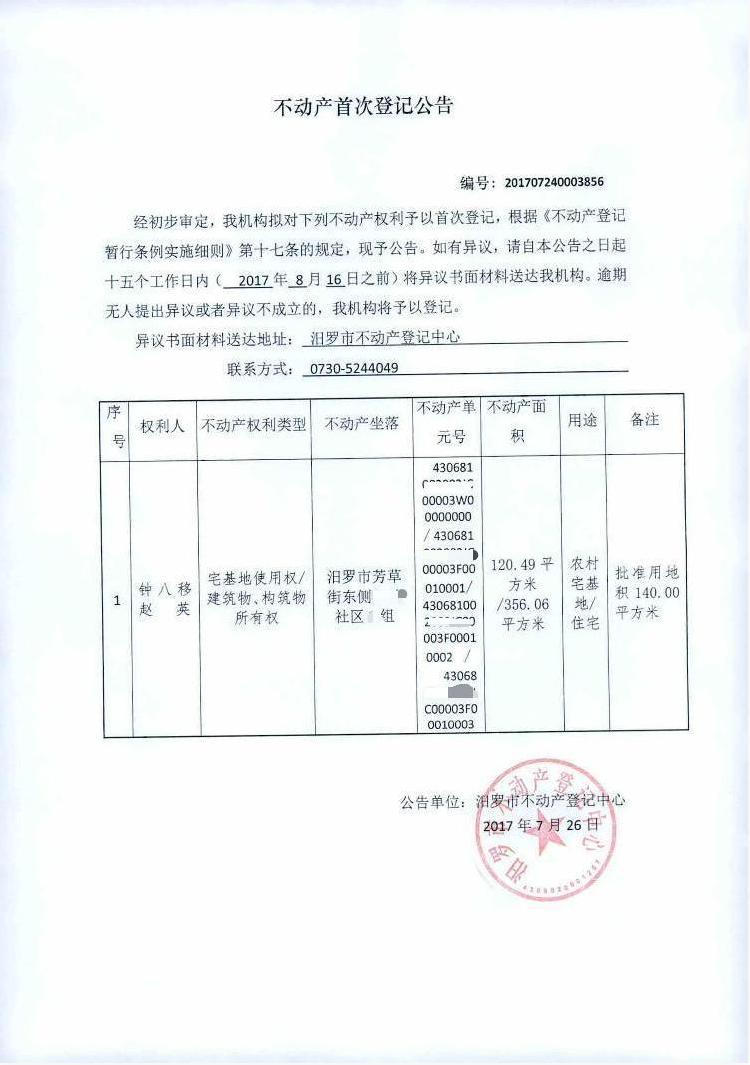 不动产首次登记公告(钟八移)