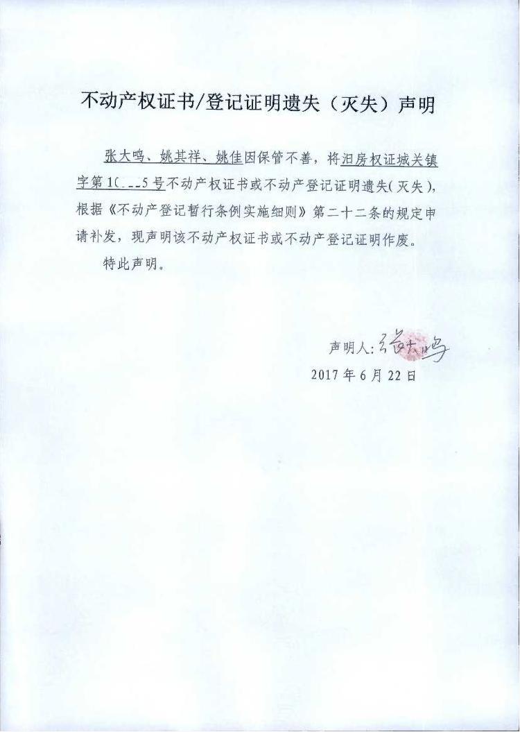 不动产权证书遗失声明(张大鸣、姚其祥、姚佳)